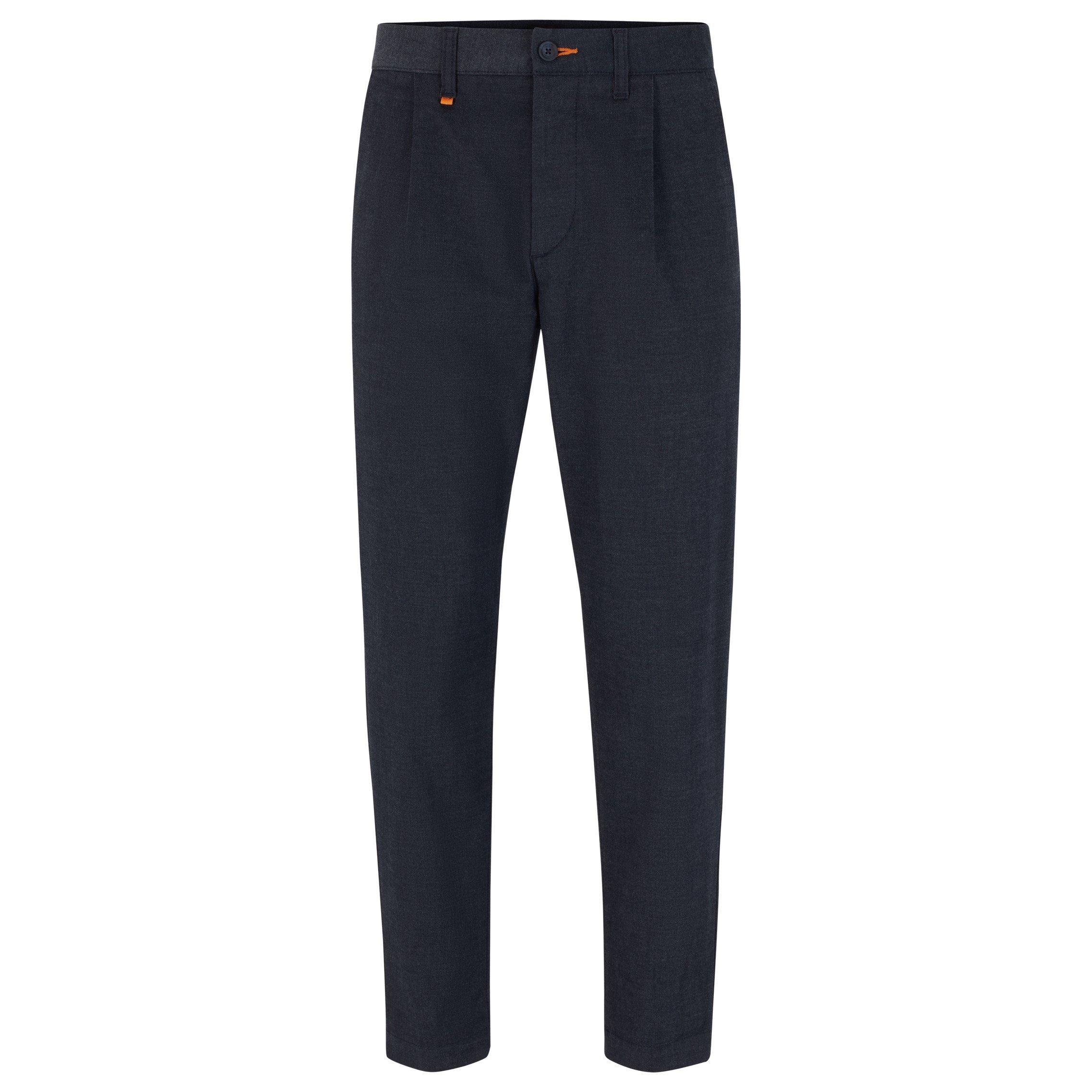 Elevate your business wear with these Chino Schino Taber Black Trousers by Boss. Expertly made from a soft cotton blend, creating a breathable lightweight appeal that enhances your comfort with this soft feel whilst its suave edge elevates your everyday ensemble. Blending functionality with sophistication these trousers boast two front slit pockets, a zip closure and back pockets. In a sleek black shade, these tailored slim-fit trousers exude an air of understated refinement lending themselves effortlessly to various occasions, be it a formal gathering or a casual outing.