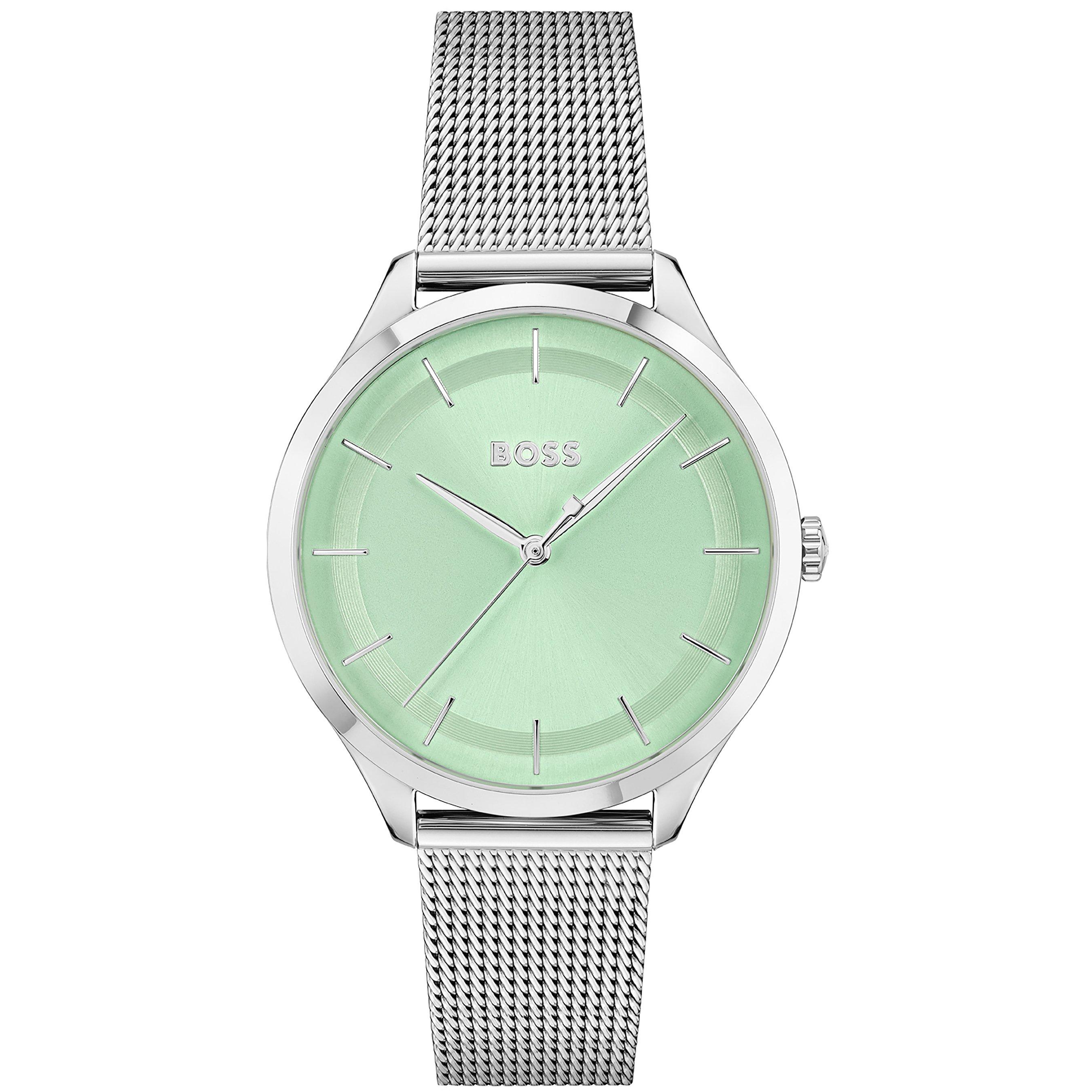 BOSS ladies watch from the Pura family. Featuring a 36mm stainless steel case, pale green sunray dial, and stainless steel mesh strap with clasp. Water resistant to 3ATM