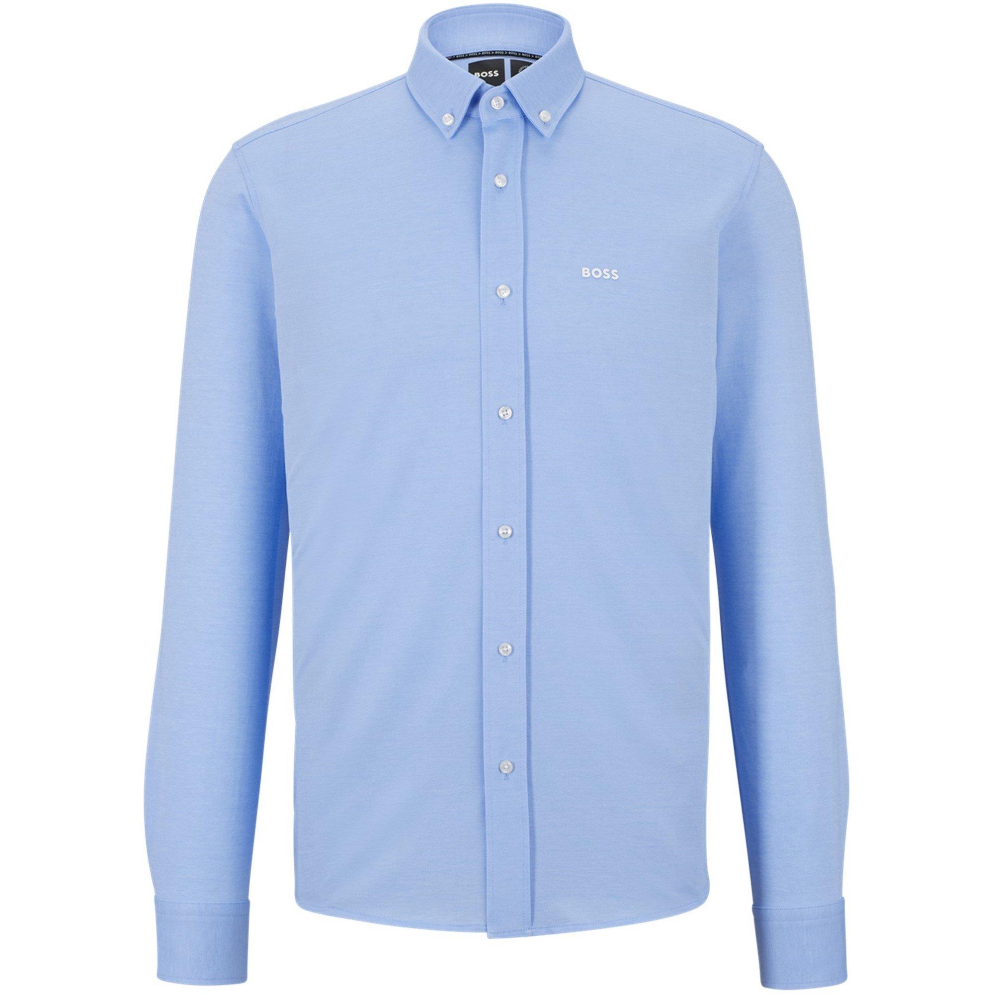 The BOSS Long Sleeve Oxford Shirt is constructed with a collared neckline and long sleeves. The design maintains a clean, structured profile.