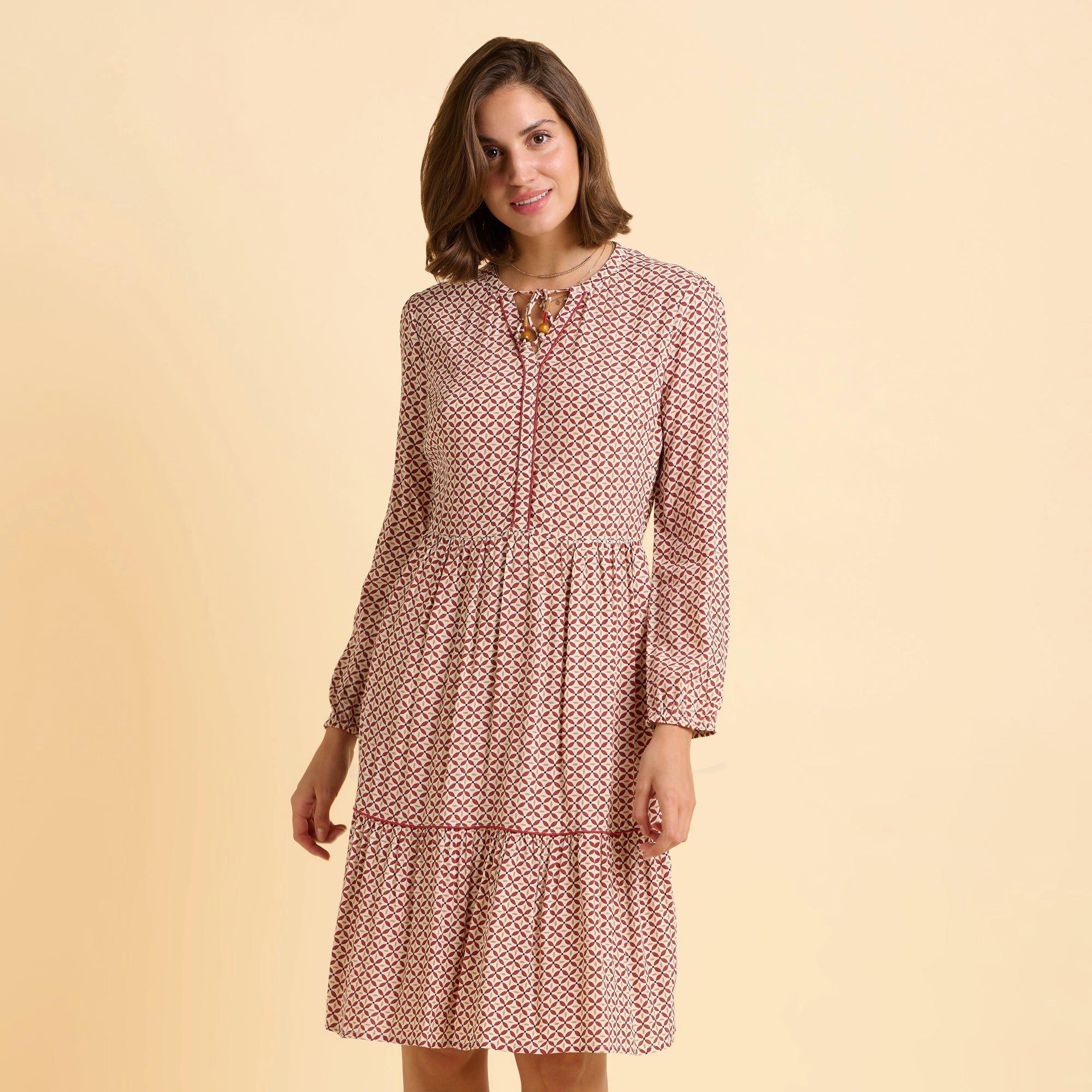 Party season just got comfy. This easy-going dress brings together lightweight fabric and a bold geometric print, with elasticated cuffs, a gathered waist and soft broderie details for a floaty, feel-good fit. Finished with a notch neckline and tassel ties. Just add metallic accessories and you're good to go.100% Viscose