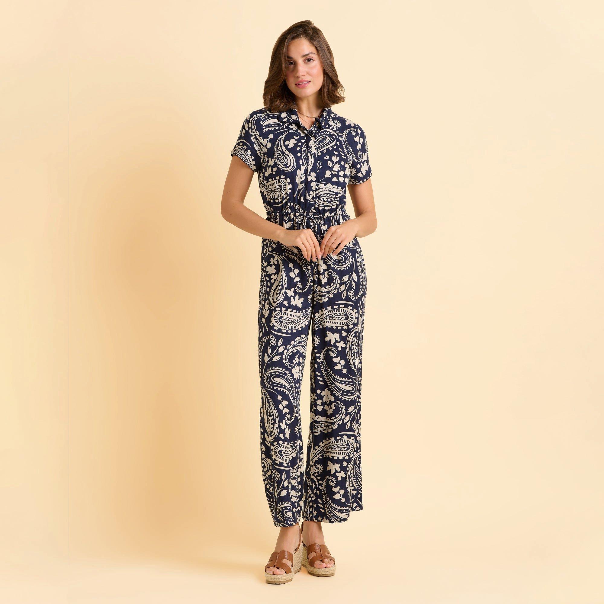 Bold and comfy, the ultimate combo for a fun day out. This printed jumpsuit features a large paisley print, a soft-edged collar with broderie trim, and a hidden drawstring at the elasticated waist. Floaty wide legs create a relaxed fit that flatters every shape. Style with sandals for daytime ease.100% Viscose