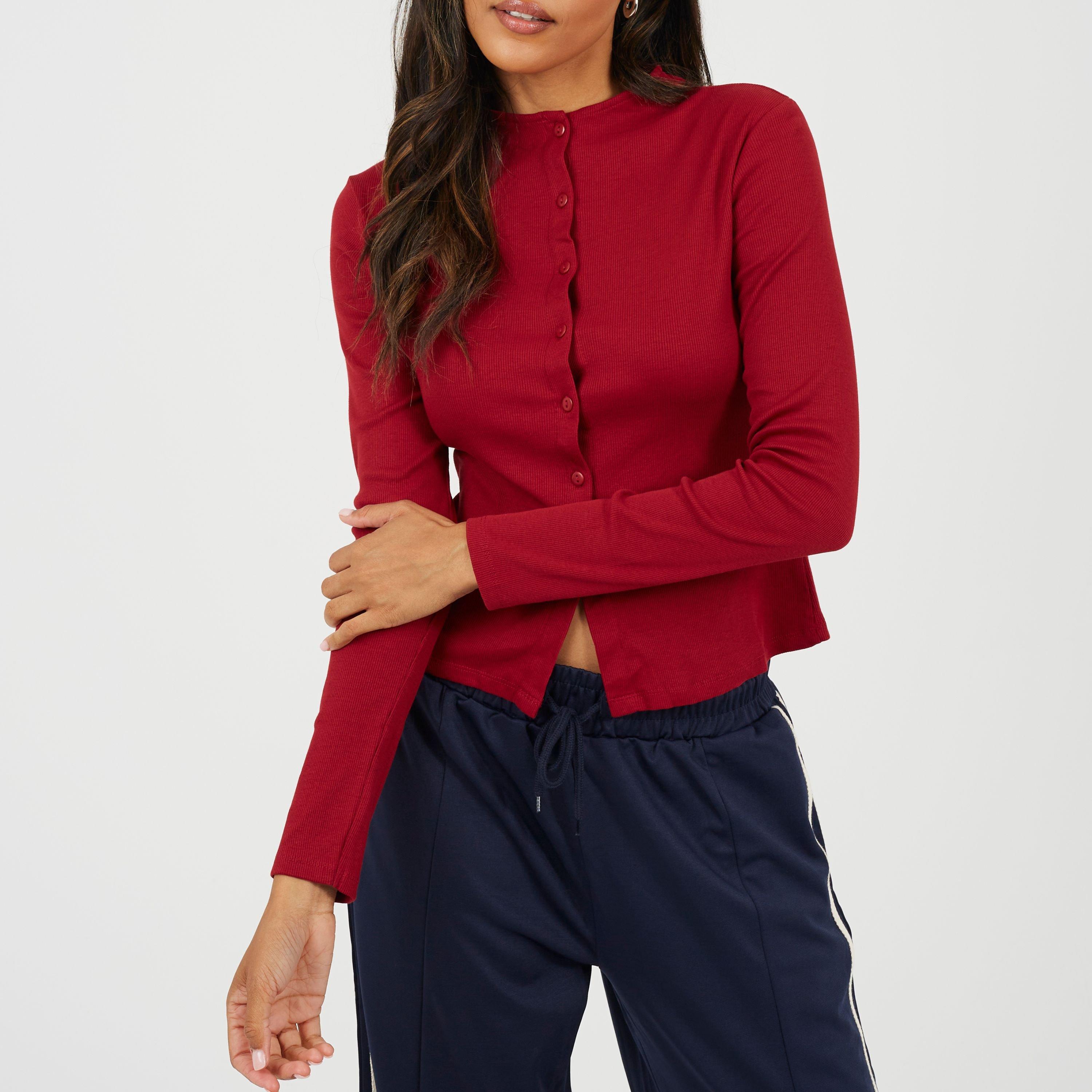Brave Soul Women's top. Crew neck, long sleeve, full front button closure. Solid deep red colour, all over ribbed fabric.