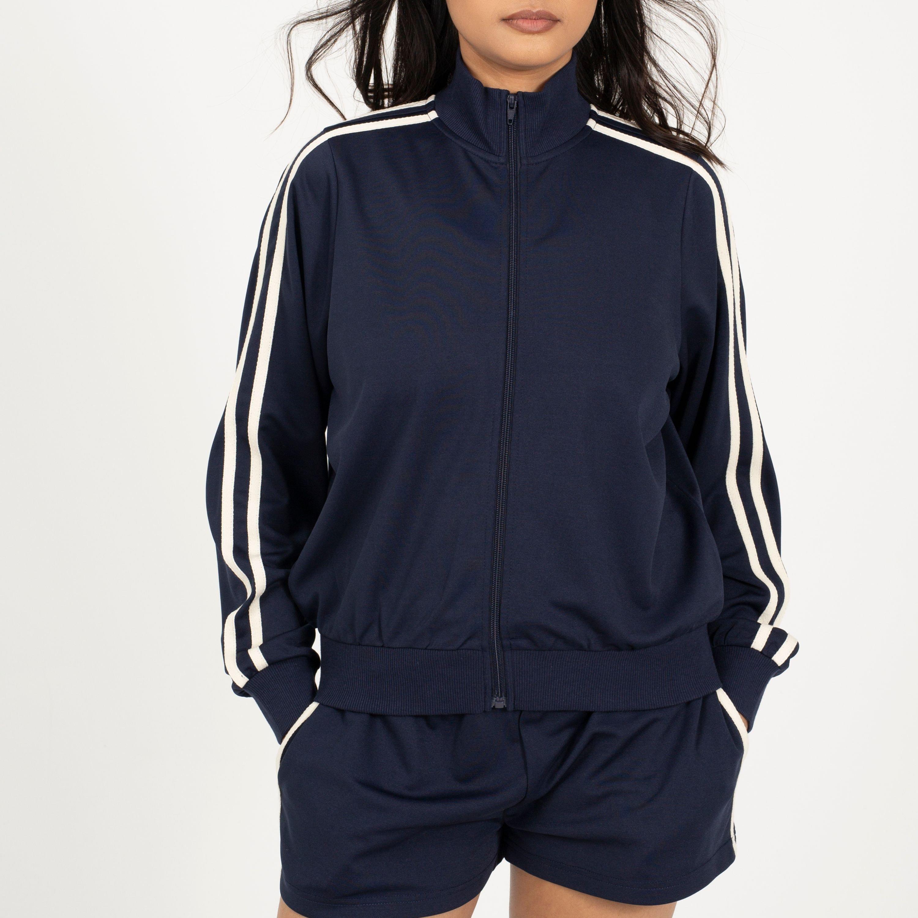Brave Soul Women's track jacket. Classic varsity style, full front closure, side stripe detail to arms. Two lower pockets, ribbed neck, cuffs and hem.