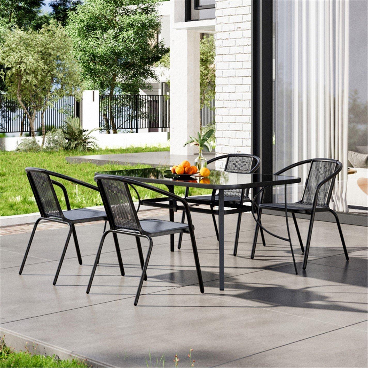 This garden table, inspired by traditional wrought-iron designs, adds a romantic touch to your outdoor space. Featuring an umbrella hole in the center, it is ideal for both sunny and rainy days. Additionally, the set includes four rattan chairs made from all-weather resistant PE rattan and supported by a rustproof metal frame, ensuring these patio dining chairs are both durable and stable.