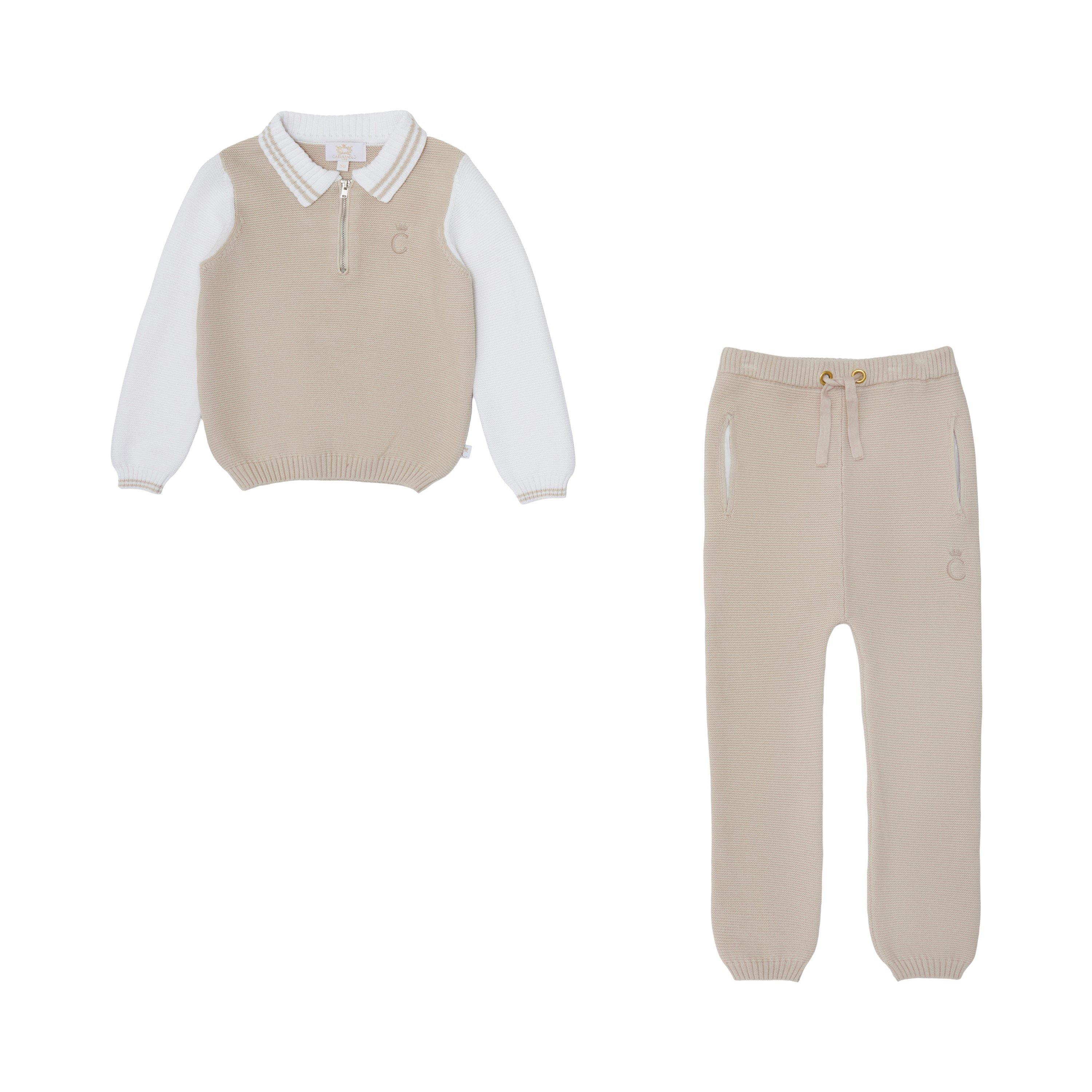 The Caramelo Kids Knitted Zipped Polo Clothing Set pairs coordinated pieces with practical detailing for everyday wear. Quality knitted fabric offers lasting wear.