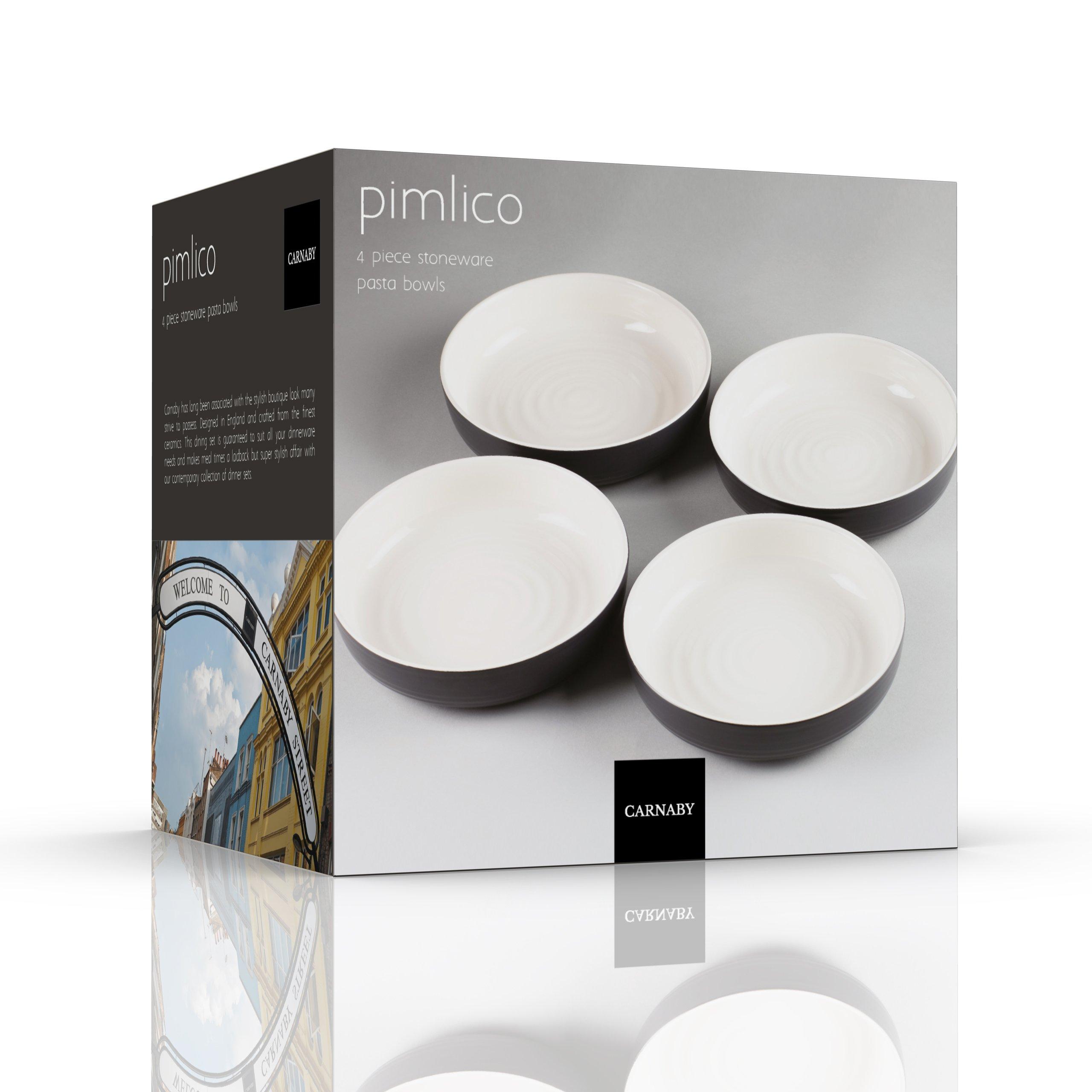 The Carnaby Pimlico Stoneware 4-Piece Ripple Black and Cream Bowls feature a circular shape with a rippled design. Constructed from durable stoneware, they suit everyday dining.