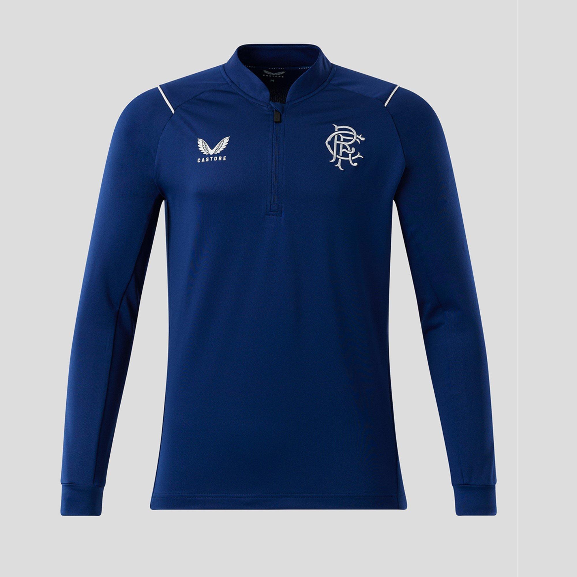 Castore's Rangers Quarter-Zip Fleece is a technical men's pullover apparel with a streamlined shape featuring strategic panelling and a practical quarter-zip design. This piece delivers warmth and comfort.