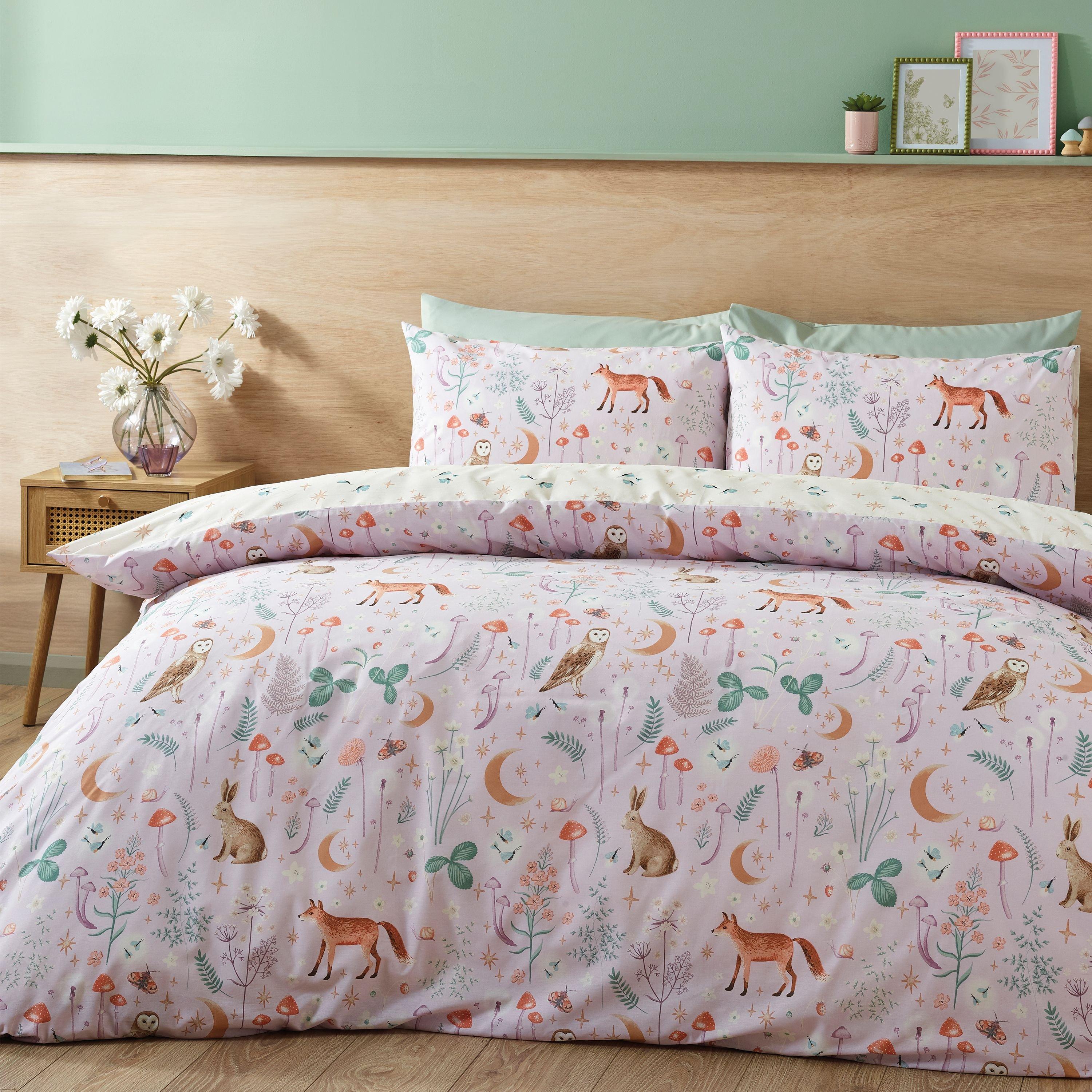 Create wonder and enchantment in your bedroom with this folklore style bedlinen. Featuring illustrations of the fox, the owl and rabbits, this bedlinen will add an element of charm and whimsy to your room. This fully reversible set features a star and feather pattern in a lighter tone providing an effortless backdrop. Created from easy-care recycled polyester and soft responsibly sourced cotton, blended for everyday use.