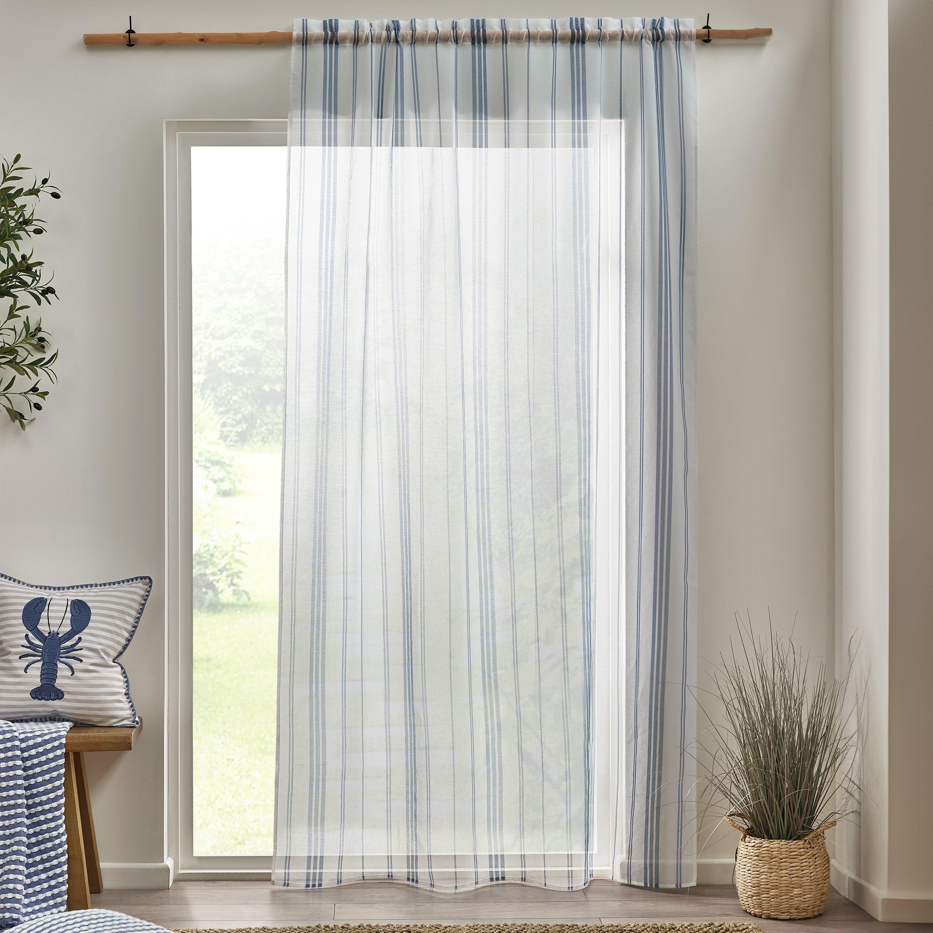 The timeless design features a calming stripe in classic blue and white bringing a touch of the seaside tranquillity into your space. With a functional slot top header and crafted from lightweight fabric to let light in and offering some privacy. Slot Top Header: Easy Installation for pole rails. Allows Natural Light: Let's in the outdoor light while maintaining a sense of privacy. Lightweight: For easy durability.