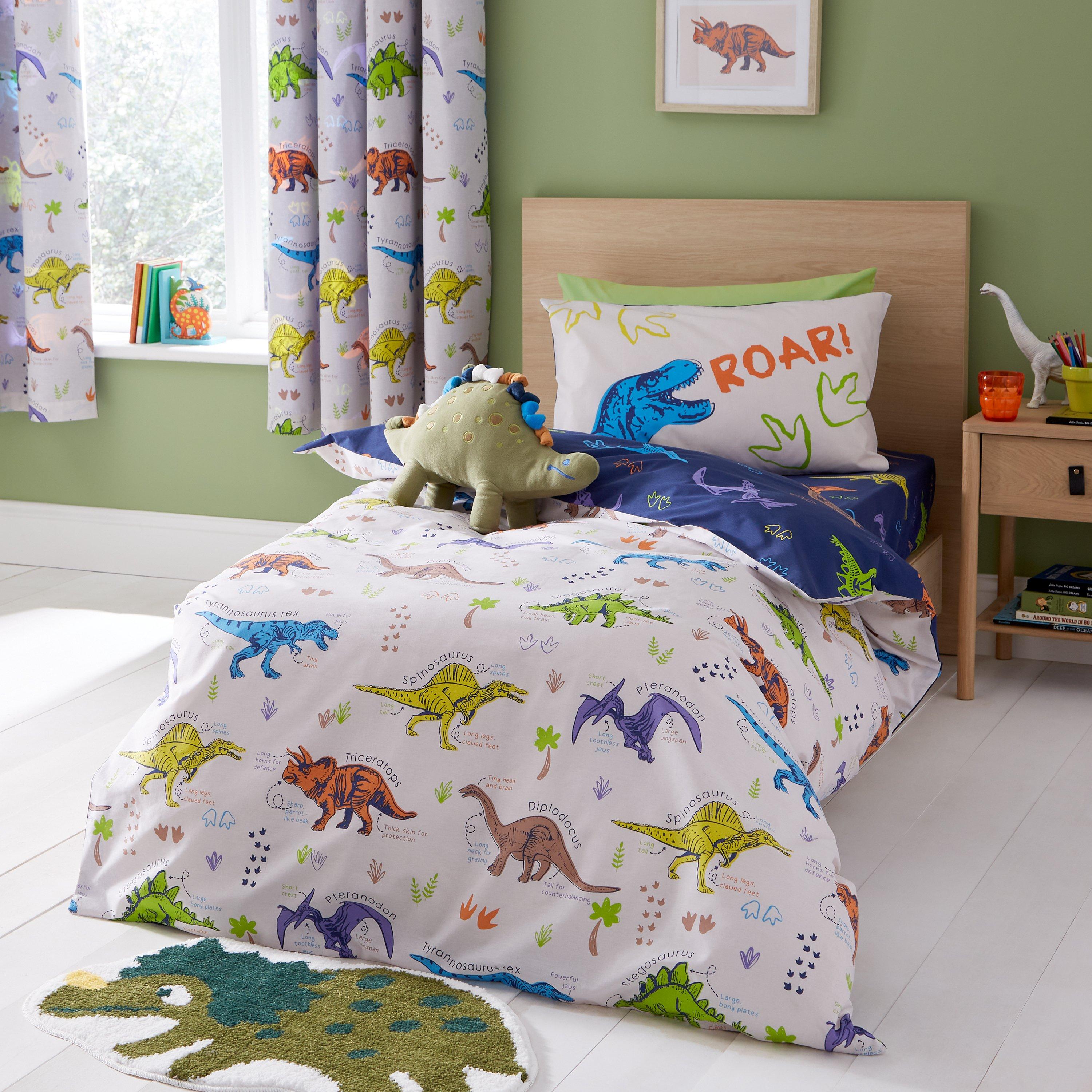 Bring your child's love of dinosaurs to life with this playful dinosaur bedlinen. Featuring cute and colourful illustrations of their favourite dinosaurs on a natural earthy base, this bedding is perfect for sparking your child's imagination and sense of wonder. Fully reversible, with a deep navy base, giving you two looks in one and created from easy-care recycled polyester and soft cotton, blended for everyday use.