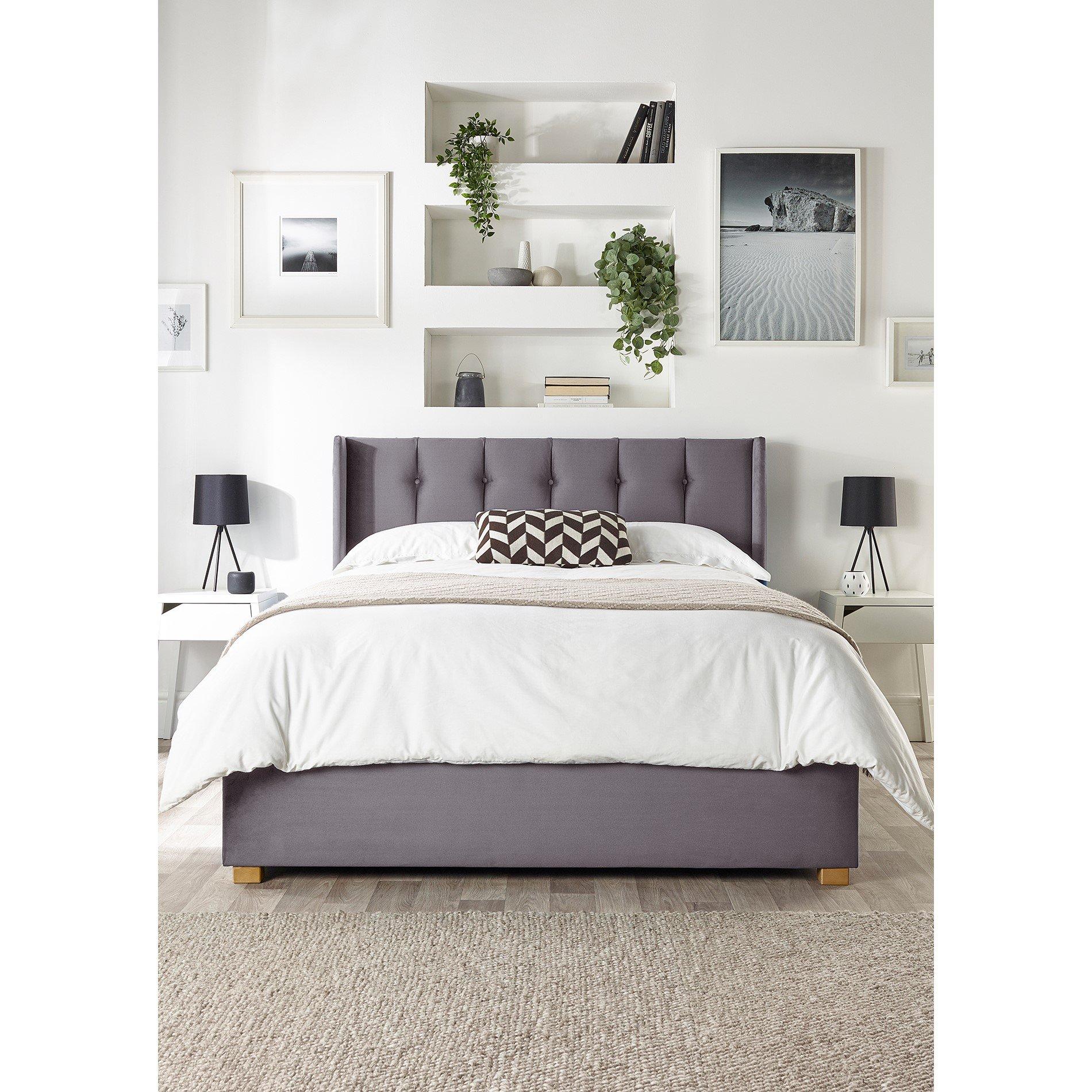 Our Catherine Lansfield Utopia Wing Ottoman Bed is a stylish storage bed manufactured in the UK and upholstered in a beautiful, brushed velvet fabric. The hand upholstered headboard features deep padding and a gorgeous, winged headboard with a buttoned vertical design. Choose from captivating bright colours including emerald, blush, light silver, steel, and navy fabric finishes. The design is finished off with stylish solid hard wood feet. The ottoman bed provides vast under bed storage that can be easily accessed with gas lift pistons, once the mechanism is open it will hold in place allowing hands free access to the large storage area. The bed comes completely with a dust sheet to keep the storage area clean, please note the storage area is not a boarded base. The bed features quality spring slats for added comfort and support. The mechanism is capable of lifting a mattress with a weight of up to 60kg. The bed is supplied flat pack, assembly takes 1-2 hours and is easier with 2 people. The bed meets UK safety standards and has also passed non-mandatory structural testing for peace of mind.