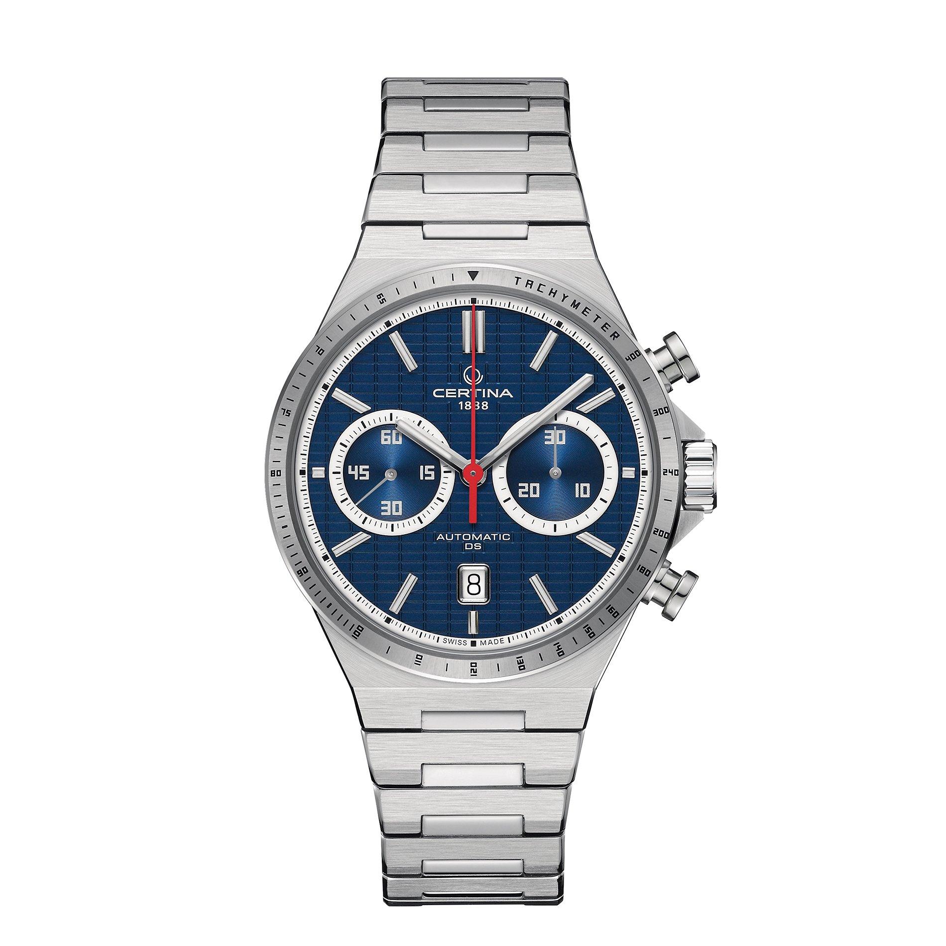 Refresh your wardrobe staples with the DS-7 Chrono Auto Watch from Certina. Built for the active lifestyle with scratch-resistant glass and a balance spring that keeps the watch in place, this men's timepiece inspired by the brand's involvement in the up-and-coming sport of padel. Whether you're a player or a spectator, solidify your credentials with this piece.