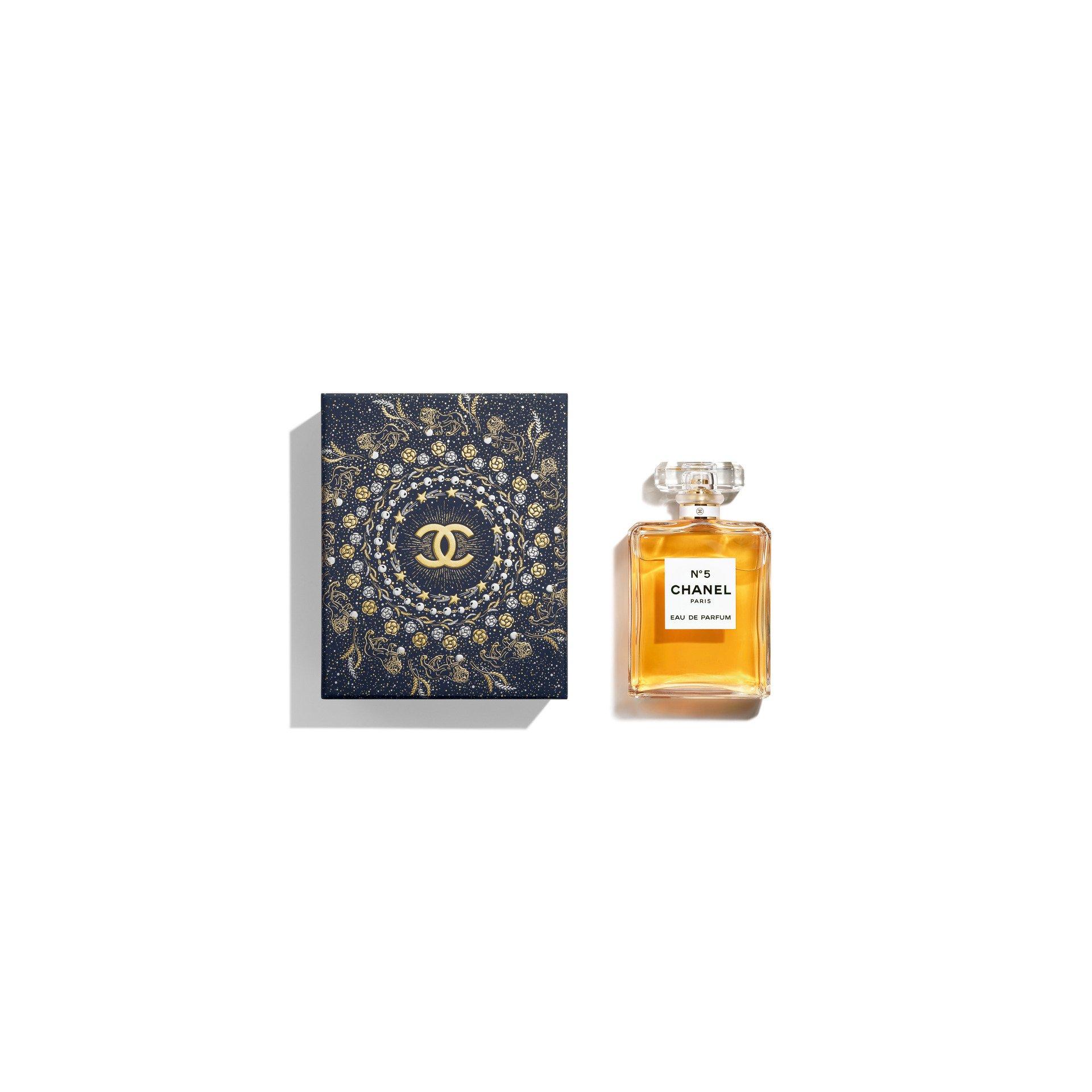 N°5, the very essence of femininity. An aldehyde floral bouquet housed in an iconic bottle with a minimalist design. A timeless, legendary fragrance. This holiday season, the timeless, legendary fragrance with an abstract floral bouquet features a deep-blue box with shimmering golden and silvery accents, studded with five emblematic CHANEL symbols.