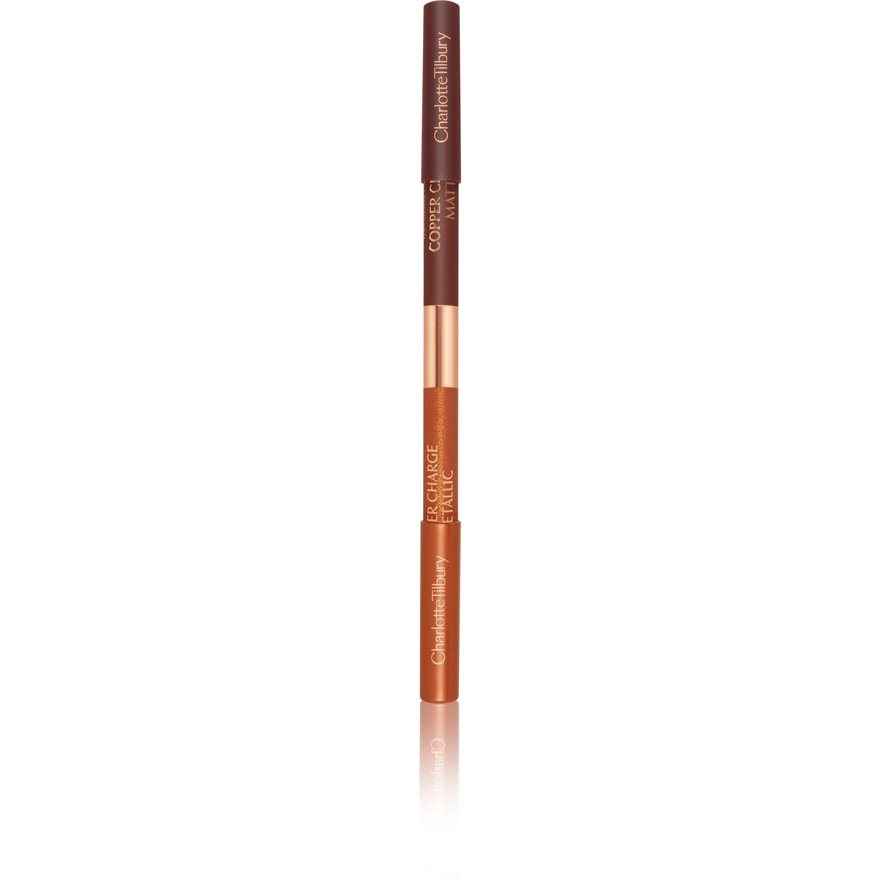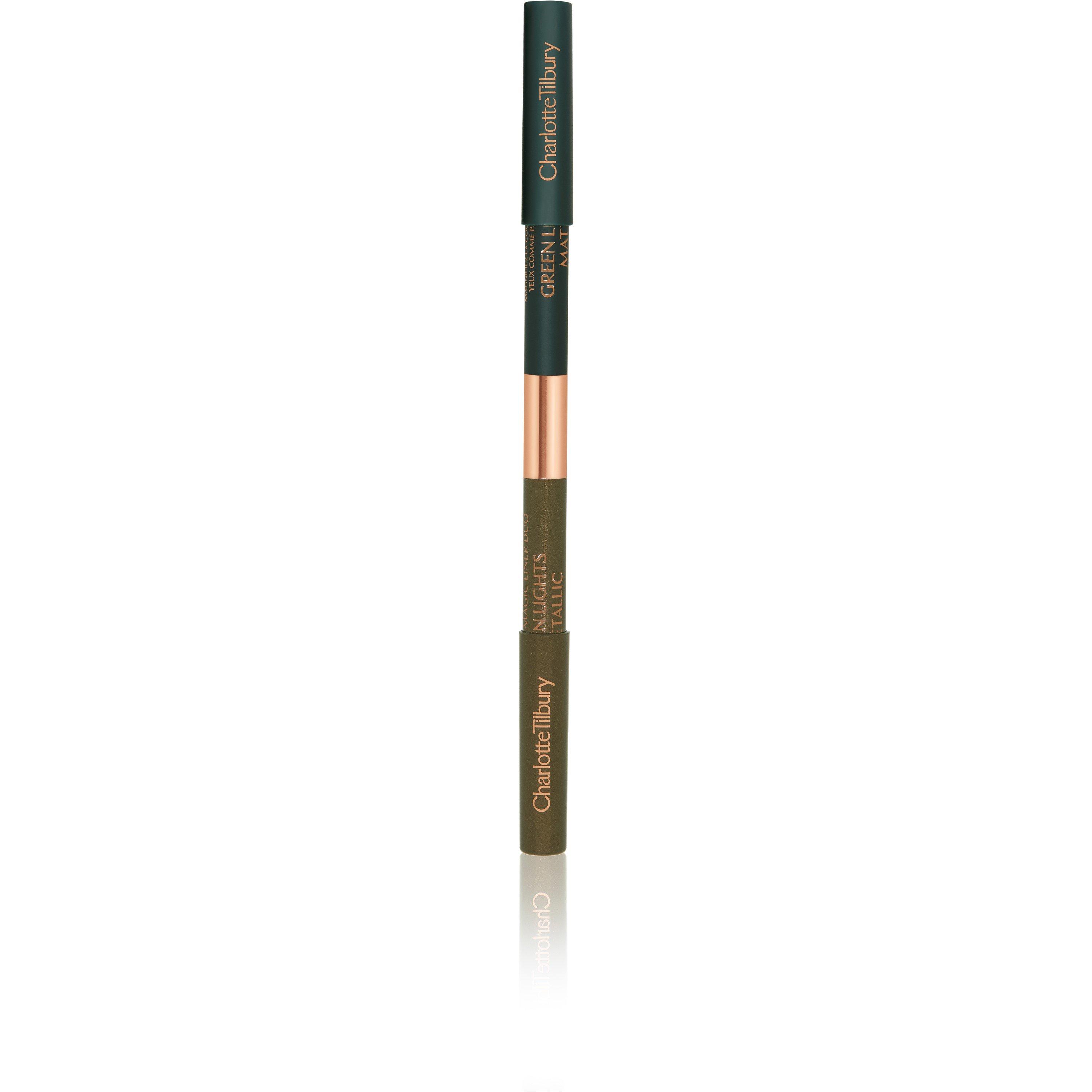Create a signature eye look with the Charlotte Tilbury Double Ended Liner, an easy to use duo liner that helps to enhance and accentuate the eyes. Enriched with natural waxes and emollient oils, the creamy formula glides effortlessly over the eyelids for long-lasting wear. For a bold eye look, use the matte end to shape the eye and then apply the metallic end to the inner corners and lash line for maximum effect.