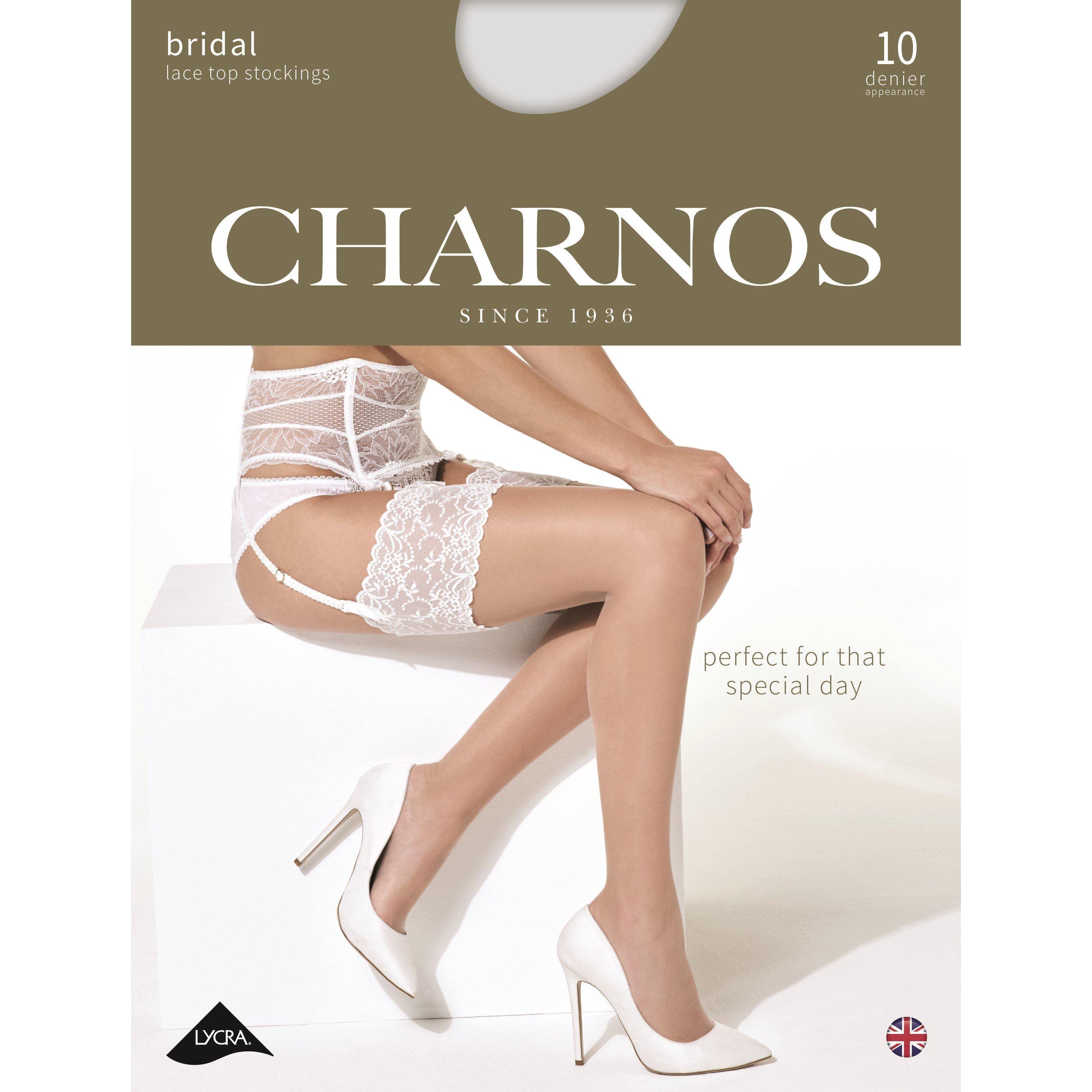 Charnos Bridal Stocking Womens Soft shiny hold ups are topped by a beautiful wide lace top perfect for your wedding day. Colours are either ivory or a champagne leg with an ivory lace top.