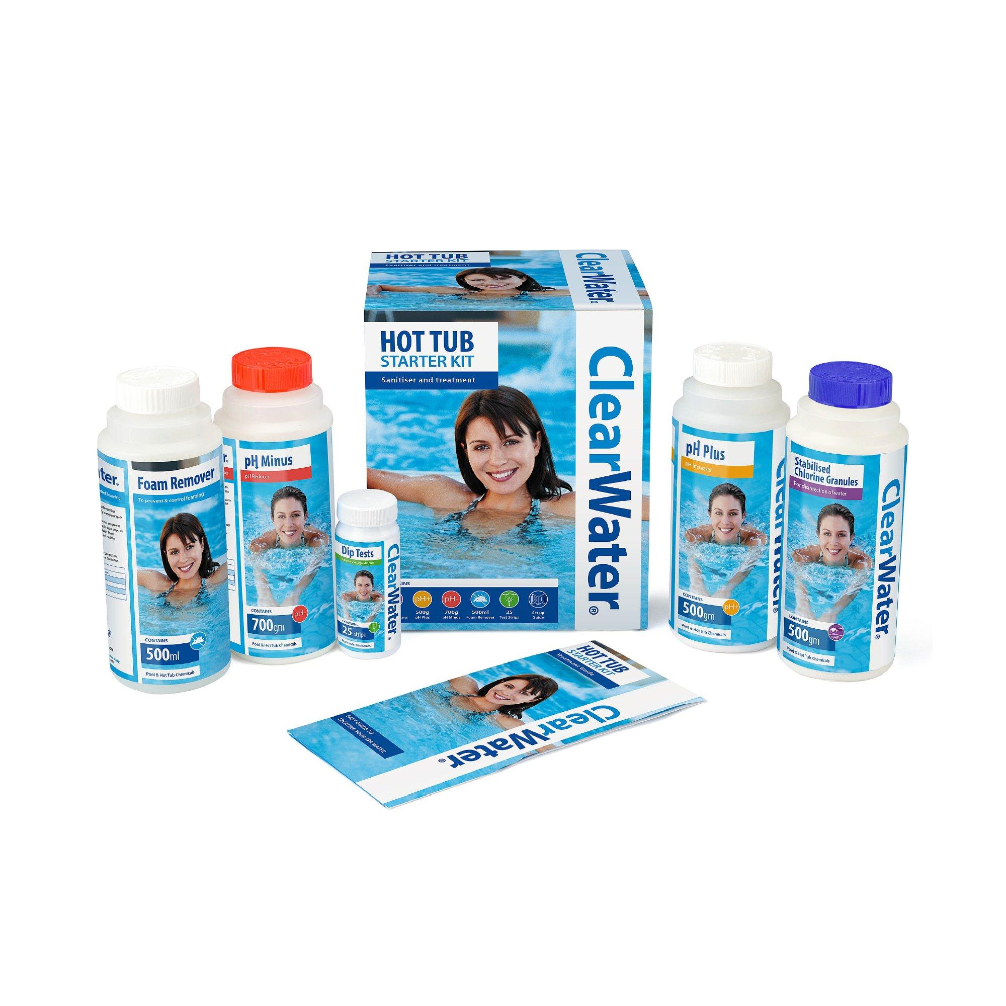 The award-winning Clearwater® Hot Tub Chemical Starter Kit is a fantastic option for new hot tub owners and is an easy-to-understand introduction to the world of water treatment. This set of chemicals is perfect for beginners as it comes with a user guide with simple, easy-to-follow instructions, dosing guidance, safety tips and problem-solving so you can confidently get started with hot tub water treatment and maintenance. The starter kit includes: 500g Chlorine Granules for disinfecting and shock treatment, 500g pH Plus and 700g pH Minus for increasing or decreasing pH levels, 500ml Foam Remover to combat any build-up on the surface, and 25 test strips to test the balance of the water chemistry. Clearwater® chemicals are designed for and tested on Lay-Z-Spa hot tubs but can be used on any and all home hot tubs. Water treatment for hot tubs is essential regardless of how long or how often you plan to use the hot tub and this starter kit has everything you need to get started and keep up the maintenance. As with all chemical products, instructions and warnings should be followed very carefully before using.