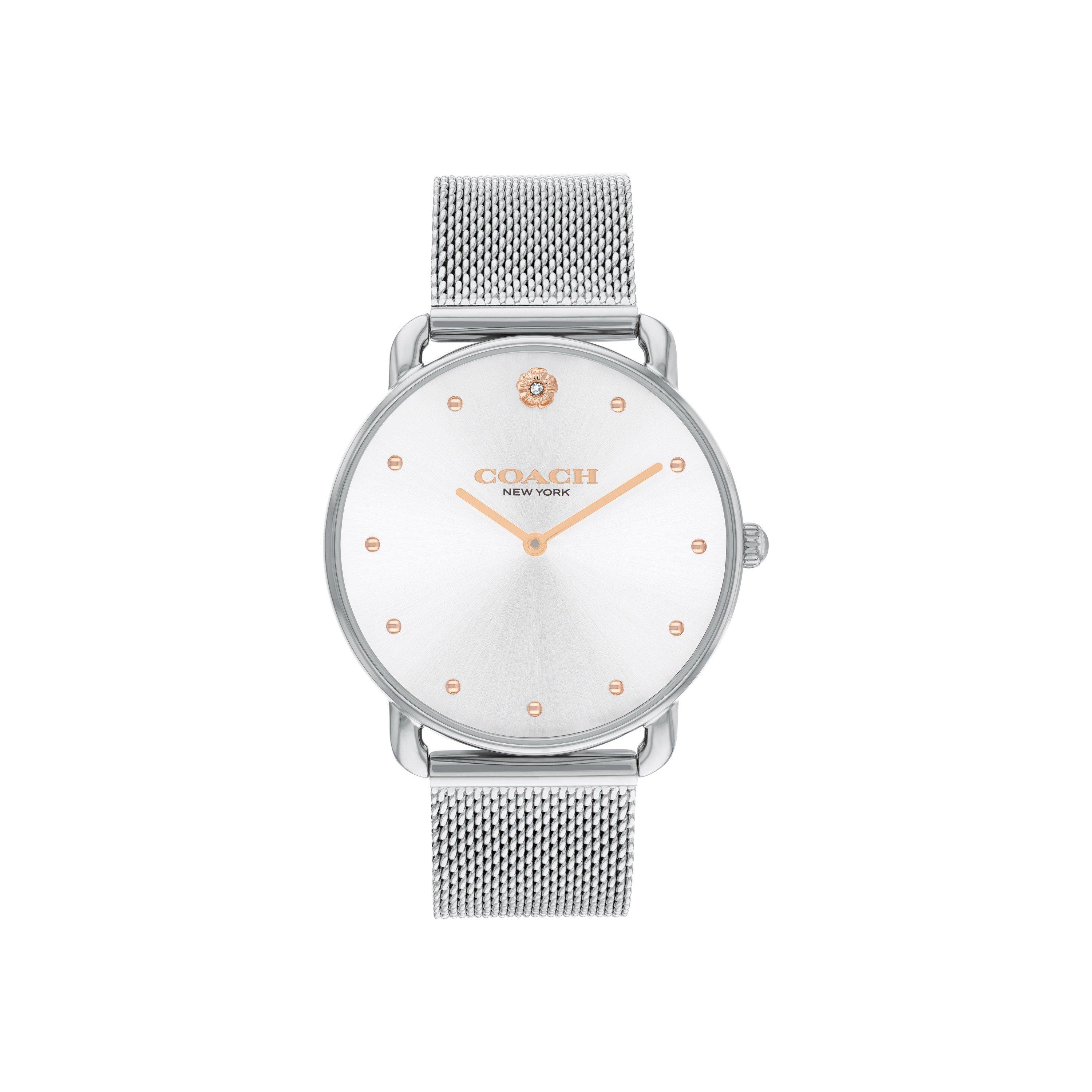 Coach ladies Elliot mesh watch. Featuring a 36mm case with white sunray dial finished with rose gold accents on a stainless steel or gold plated mesh bracelet.