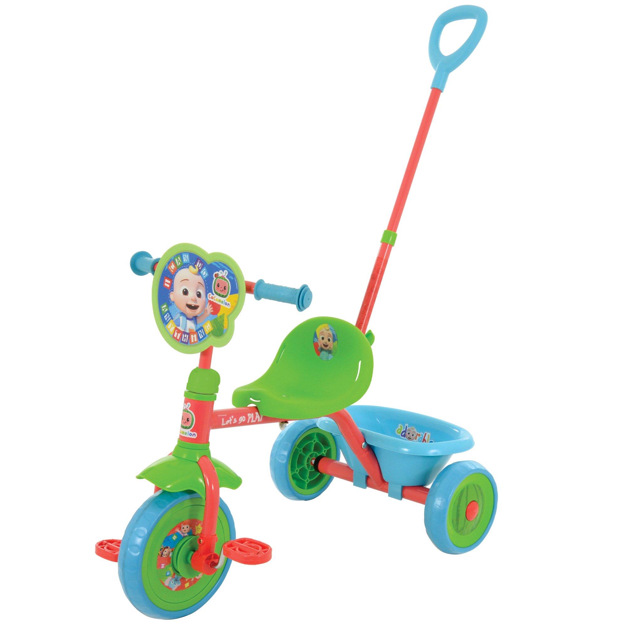 Let's go play! Get on the move with this super cool trike featuring character favourites JJ, TomTom, Kiki, Yoyo and Ello! Perfect for little ones finding their feet, this ride-on is not only designed for comfort with it's moulded seat and soft handlebar grips, but safety also with wide, puncture-proof EVA tyres for stability and sturdy steel frame. A front mudguard prevents riders from getting too messy and protects from debris. The easy switch front wheel clutch mechanism allows kids to rest their feet on the pedals in parent push-along mode, whilst using the adjustable parent handle. The handle can be removed and pedals engaged once your child is ready to go it alone, improving confidence and coordination. Can be adjusted to growing children as confidence and ability improves with adjustable handlebar height of 50-53cm and a seat height of 32cm. The removable rear bucket is great for ride-along storage for all your favourites toys! CHARACTER FAVORITES - officially licenced with character favourites! Featuring brightly coloured decals, shaped plaque and components ideal for visual development!