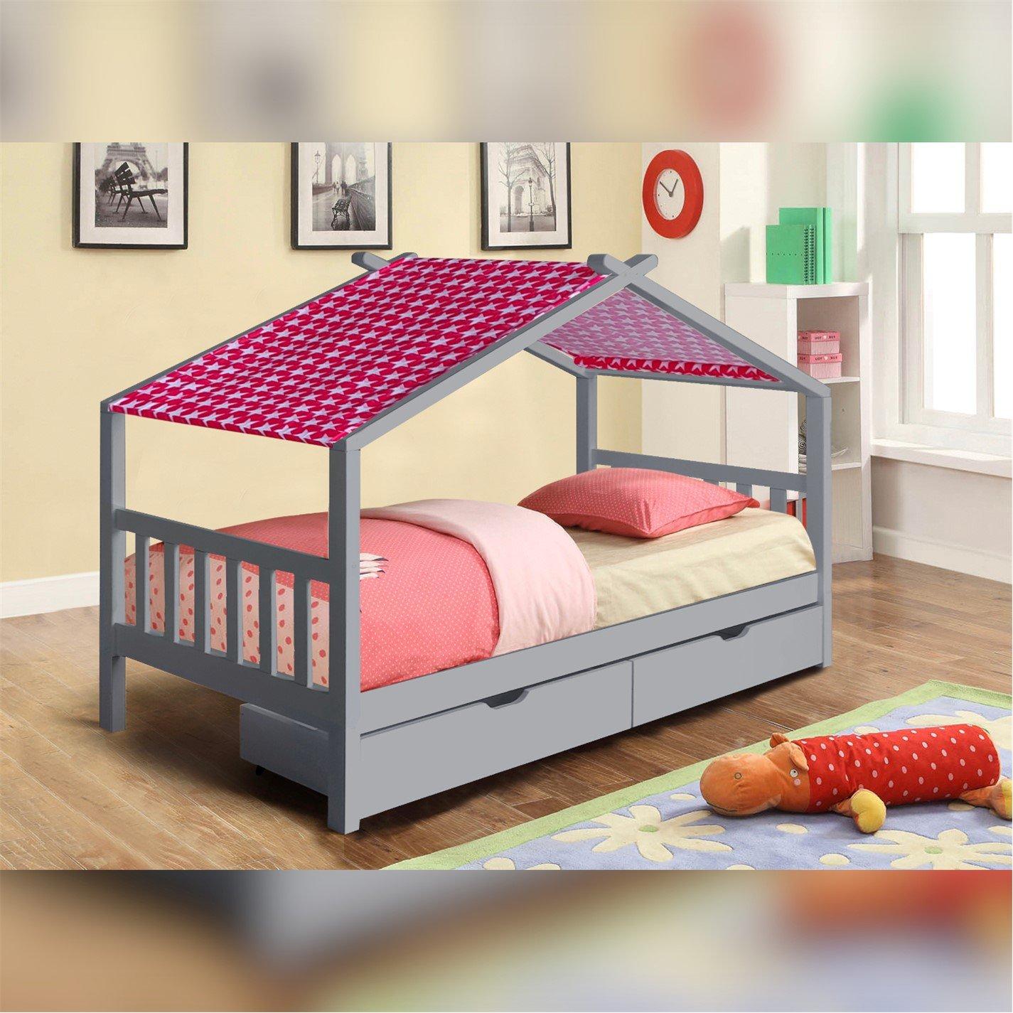 This 3ft house style bedframe is the perfect addition to any kids bedroom. Available in natural, white or grey, there is the option to add a coloured tent in either blue, red or grey. There are also handy drawers underneath the bedframe to provide storage space. This frame is supplied with a mattress with a medium soft feel spring system and a depth of approximately 17cm.