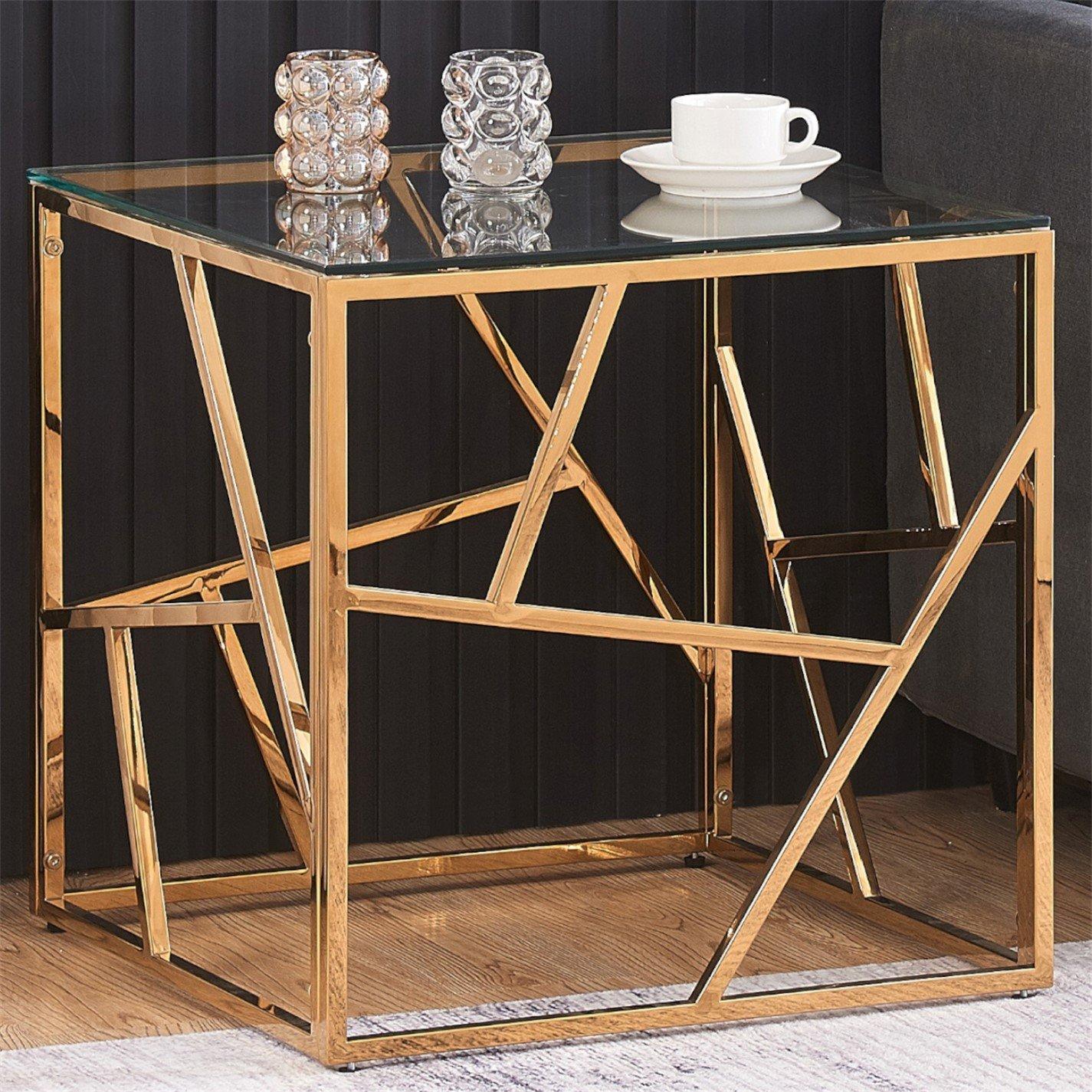 This elegant square end table exudes sophistication with its glass tabletop and metal frame in a striking gold or silver finish. The unique geometric design, featuring intersecting lines and a sleek silhouette, creates a captivating focal point in any living space. Crafted with meticulous attention to detail, this side table offers both style and functionality, providing a convenient surface for displaying decorative accents or serving refreshments. Its compact size makes it a versatile addition to your home, seamlessly complementing various decor styles while adding a touch of modern glamour. Elevate your interior with this exquisite piece that effortlessly combines form and function.