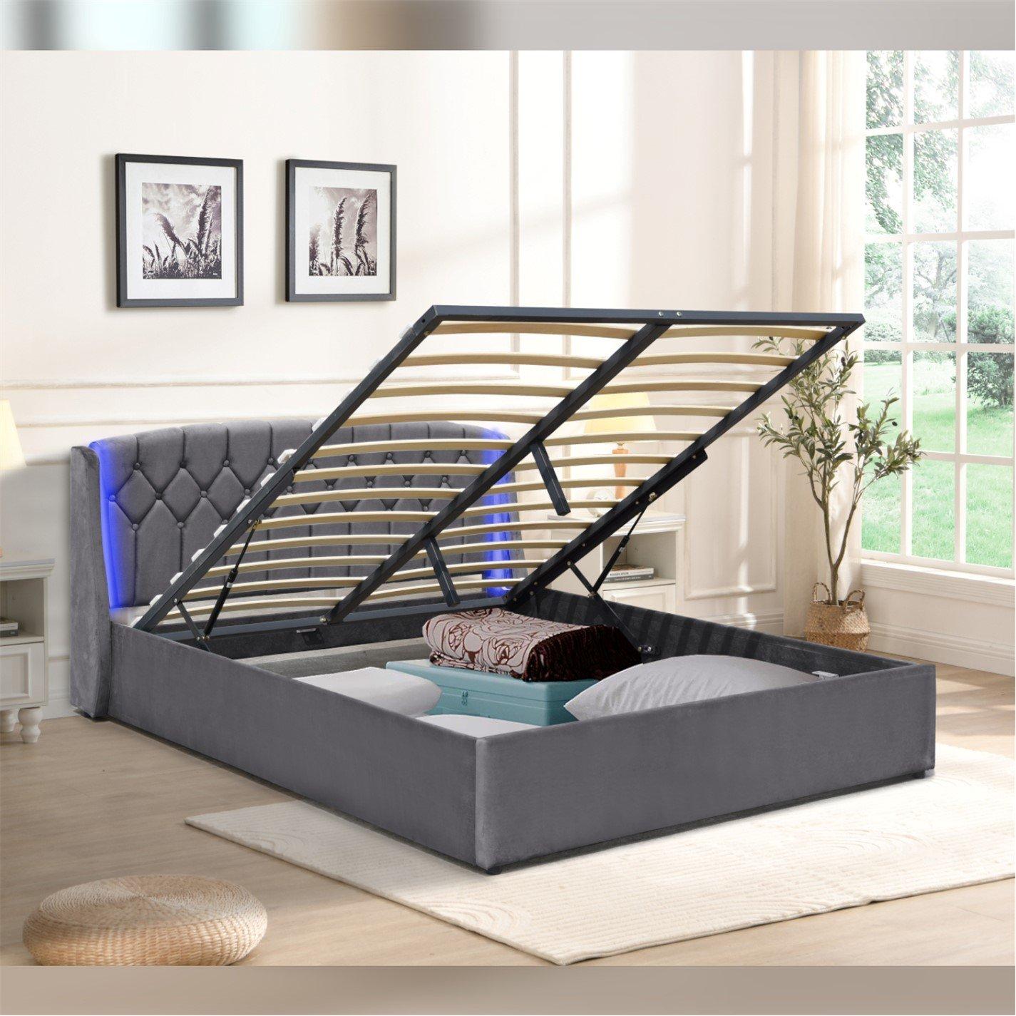 Upgrade your bedroom with this fabric gas-lift bed frame, featuring a sleek and modern design that will elevate your space. Crafted with a durable frame and a luxurious fabric upholstery, this bed frame boasts an eye-catching tufted headboard with integrated LED lighting, adding a touch of sophistication and ambience. The gas-lift mechanism allows for effortless access to the under-bed storage area, providing ample space to keep your bedroom organised and clutter-free. Available in grey or green and in 3ft, 4ft6, or 5ft sizes, this bed frame is versatile and adaptable to fit your room's dimensions. Elevate your sleeping experience with this stylish and functional bed frame.