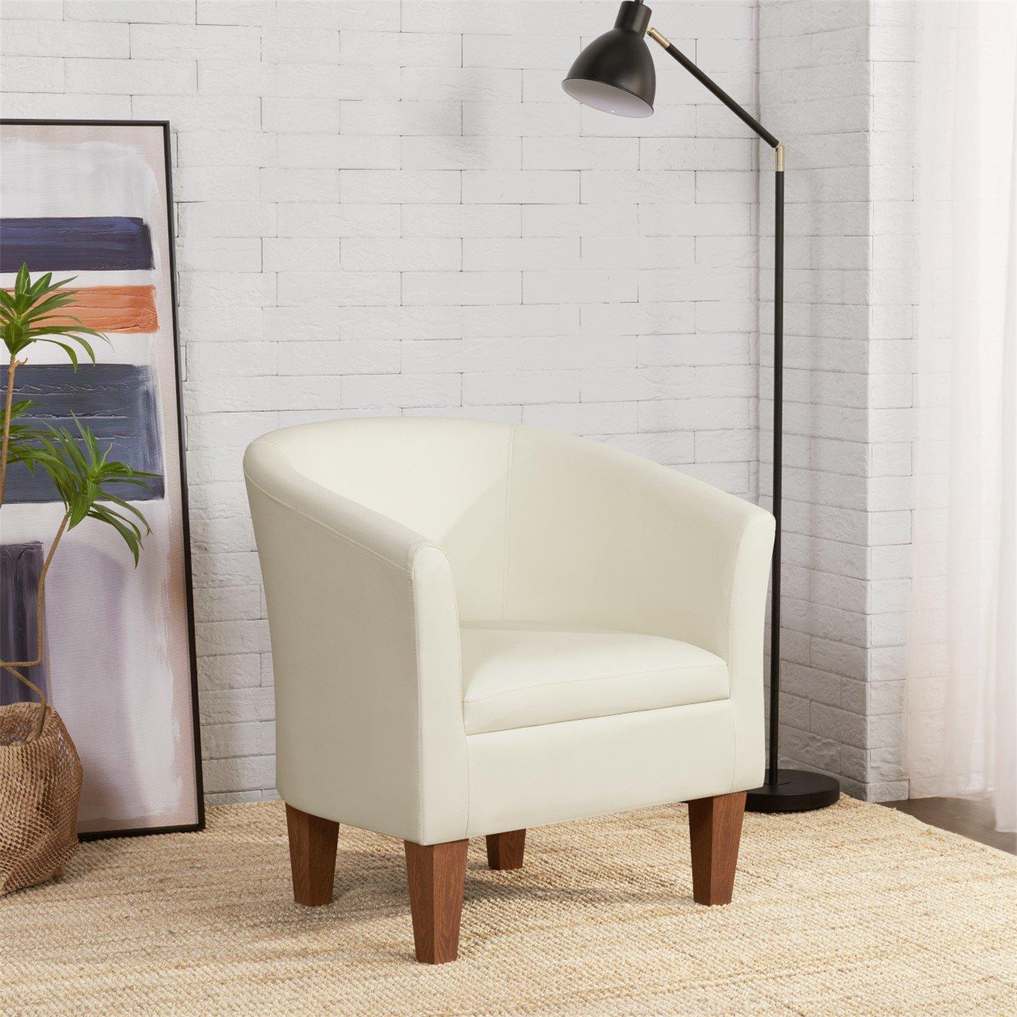 We bring to your this fantastic addition to any room in your home. Our tub chair is stylish, versatile and most importantly, comfortable.,This beautiful Tub Chair is upholstered in a quality faux leather in a choice of 4 colours; Black, Dark Chocolate Brown, Cream or Red. The frame is solid timber providing sturdy support for whoever is relaxing in it. Our Tub Chair is excellent value and is a modern, elegant addition to almost every room. It provides a comfy, cosy and modern place to relax.