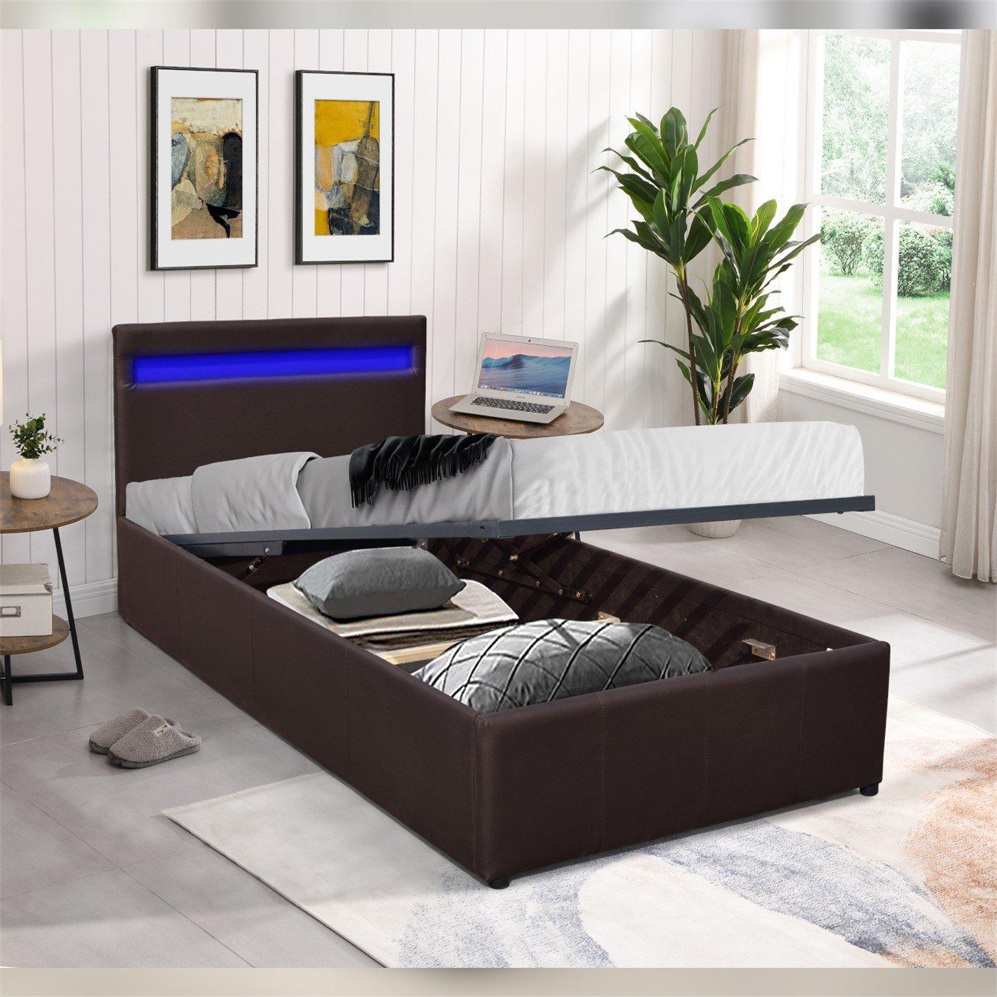 This modern bed frame is upholstered in a soft hopsack fabric in either light grey or dark grey, or faux leather in black or brown and in 3ft, 4ft, 4ft6 or 5ft size.,The frame features a large panelled headboard with stitching detail and low foot board with understated tapered peg feet to add a contemporary touch to any bedroom.,Towards the top of the headboard is an LED colour changing display which illuminates and flashes a variety of colours, or can be made static on one colour of your choosing to add atmosphere. LED Lights built into the headboard & simply need plugging into a standard 230v socket. Power adaptor, cable & plug & Remote controller all come with the bed. The remote is wireless and can be used to select the various light features. This frame features an innovative storage space under the bed which can be accessed by lifting the metal frame by a fabric handle. The gas hydraulics will enable you to lift with only a slight effort. Please note that this is straight to floor storage.