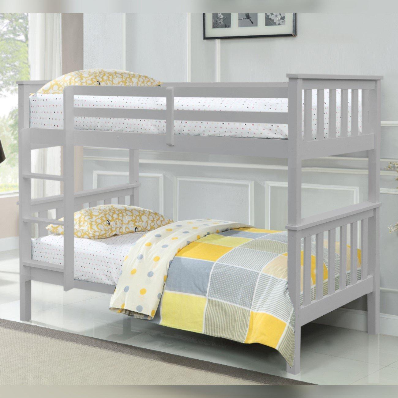 This beautifully built Scandinavian Pine bunk bed is designed to look great and provide you with all the functionality of any other bunk bed. The solid, sturdy frame can be delivered to you in a grey, finish, designed to match all the rooms in your house.,To make your purchase as simple as possible, the Wembdon bunk can be positioned wherever you want it because the ladder can be positioned on either side.,When they get too big to be sleeping in a bunk bed with their siblings, this one can be split down into two identical beds. This bed comes flat packed for simple home assembly with all tools and instructions included.