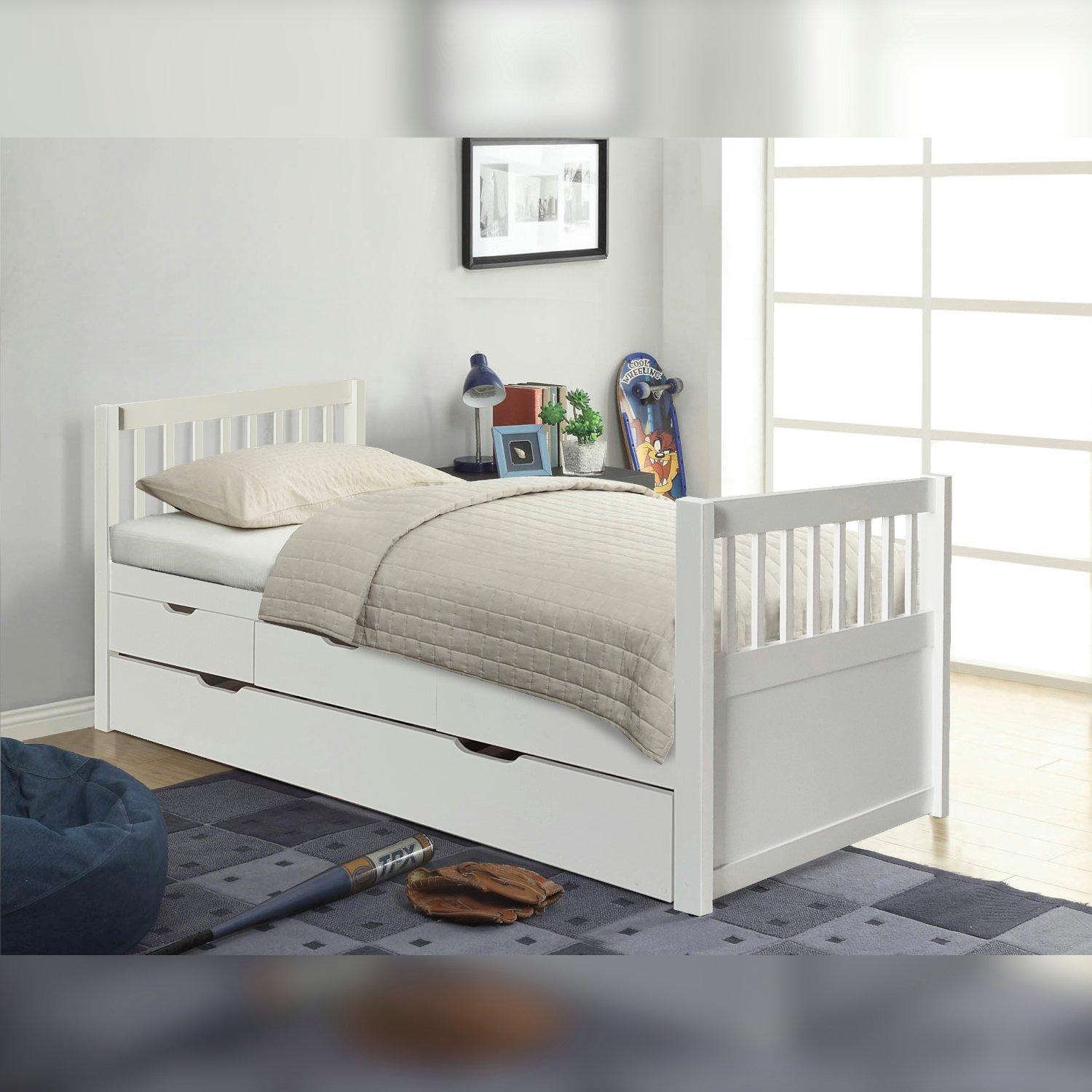 This 3ft cabin bed is the perfect addition to any bedroom. Available in natural, white or grey, this bed offers storage with handy drawers underneath the bed. There is also a trundle underneath the bed that can be used for guests. This guest bed includes 2 mattresses with a medium soft feel spring system and a depth of approximately 17cm.