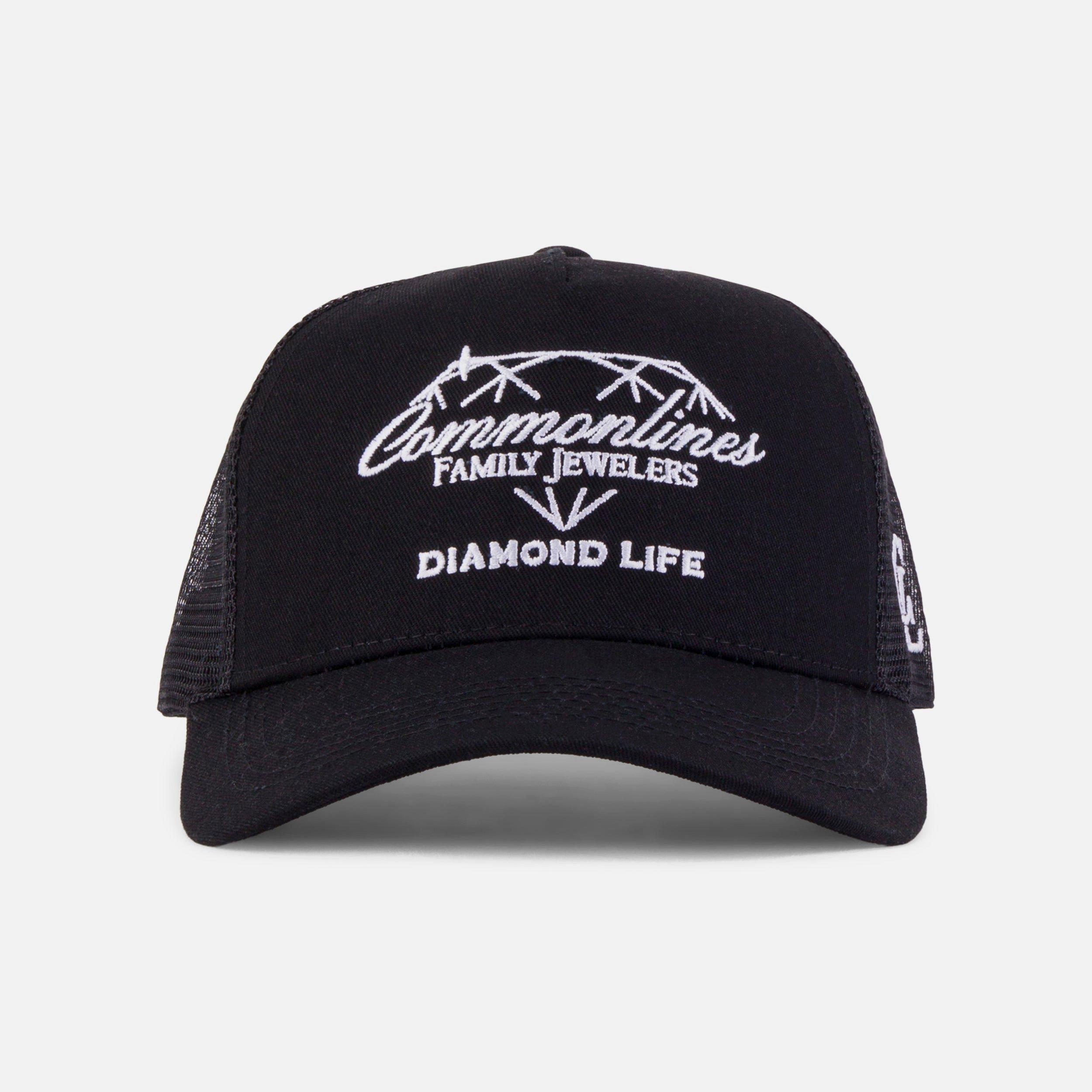Introducing the Diamond Life Trucker Cap, a classic trucker silhouette crafted from cotton twill, featuring a mesh back, snapback adjuster, and embroidered Diamond Life logo on the front.