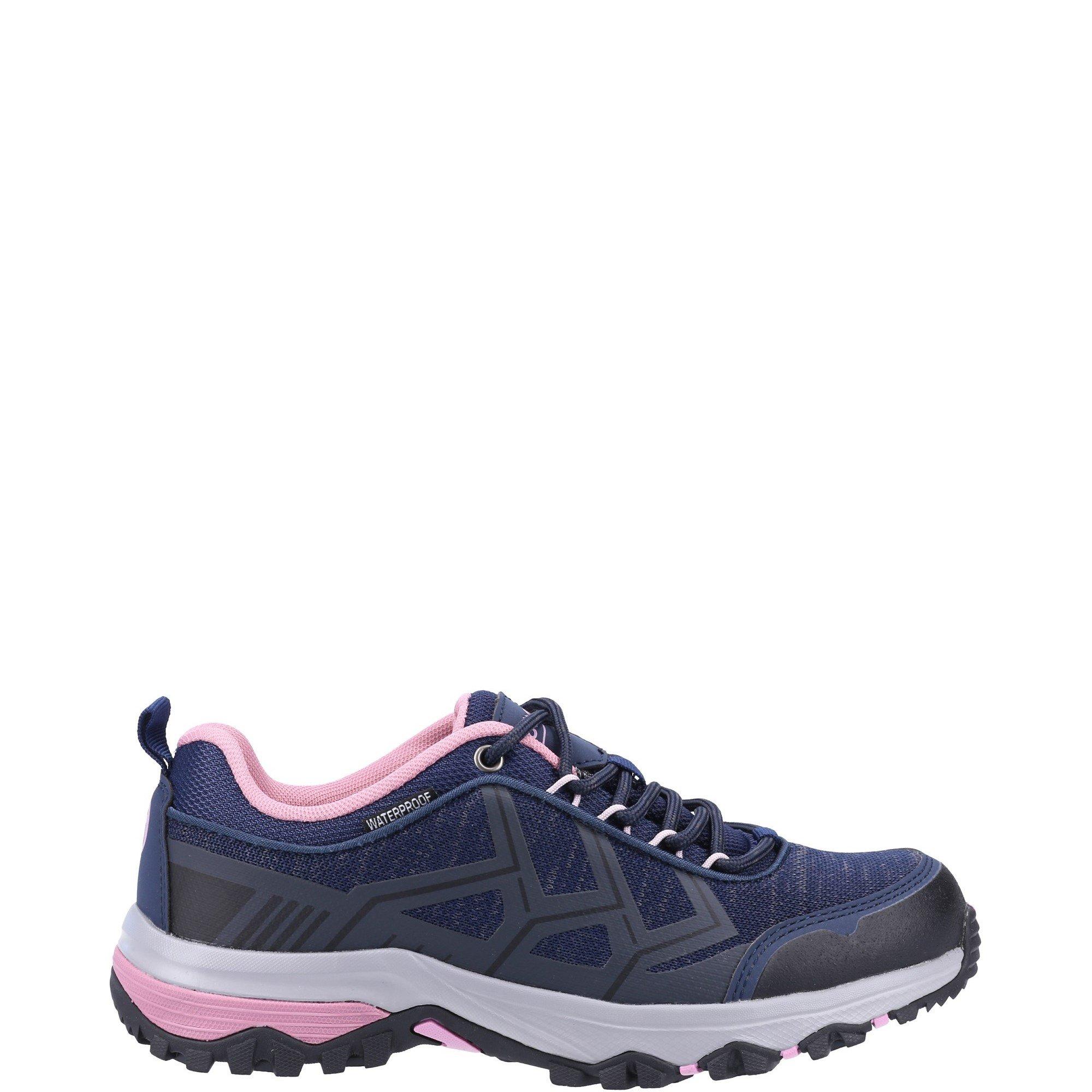 This ladies hiking trainer has superior grip for muddy trails. The upper is eco-conscious being made from 85% of rPET (recycled plastic bottles). Included speed lacing hooks and waterproof membrane.