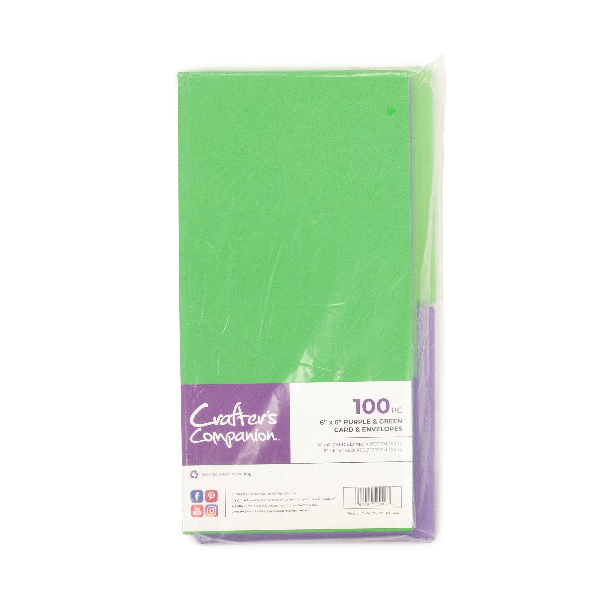 Includes 50 blank 6” x 6” cards. Purple and green - includes 25 of each colour. Also includes 50 matching envelopes. Cards are 250gsm in weight; envelopes are 100gsm in weight.