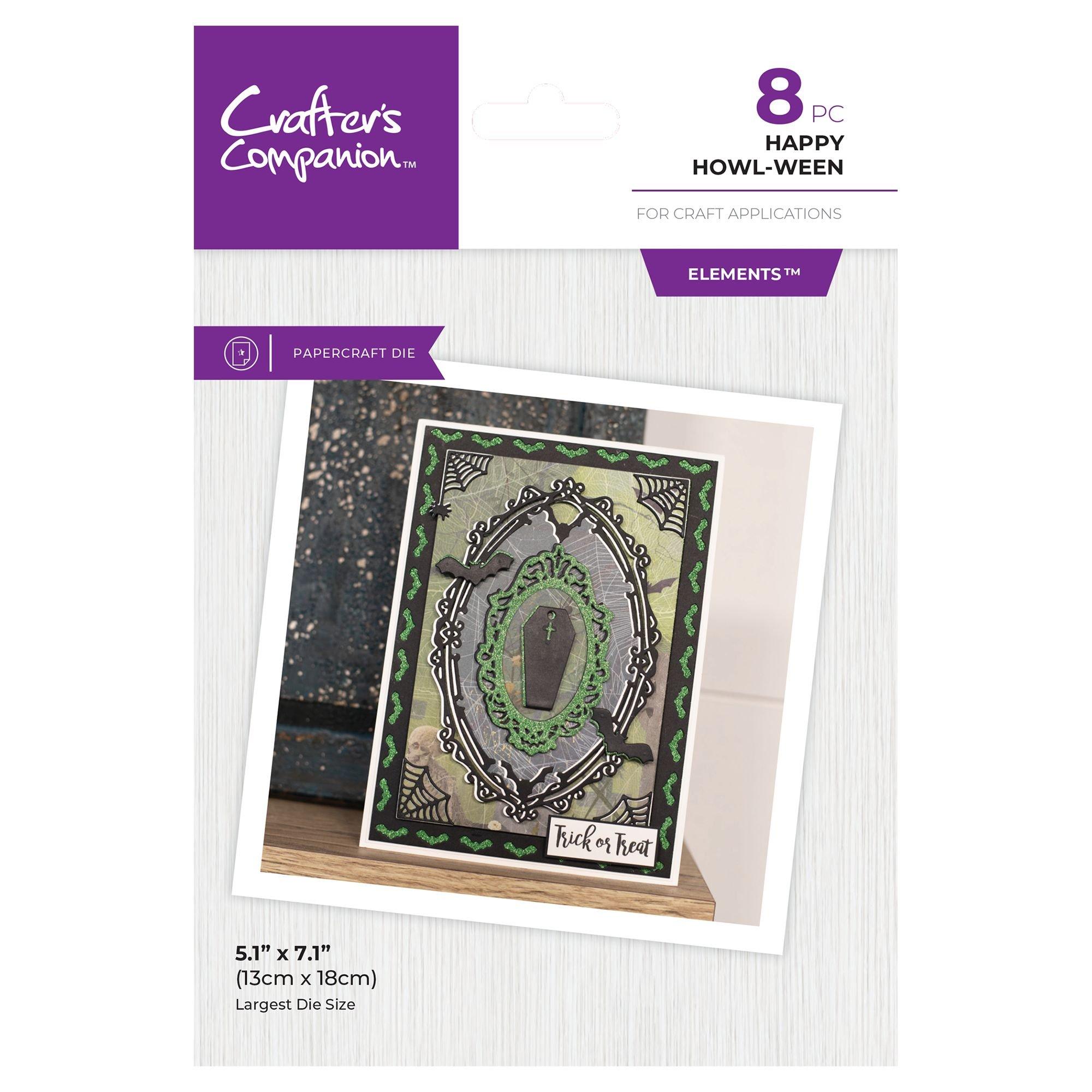 Includes eight dies to cut different sized and shaped frames featuring bats, cobwebs, and coffins. Largest die size: 5” x 7”. Compatible with the Midi, Junior, and Gemini II die-cutting and embossing machines. Part of the Metal Die Create-a-Card - Frame it Die sets range from Crafter’s Companion.
