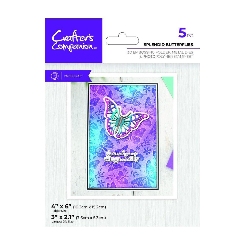Create a raised and embossed pattern of butterflies and foliage on your cards, journal covers, event stationery, and more. Plus finish your card with a centrepiece butterfly and “Spread your wings and fly” sentiment. The embossing folder fills a 6 x 4 card from edge to edge.