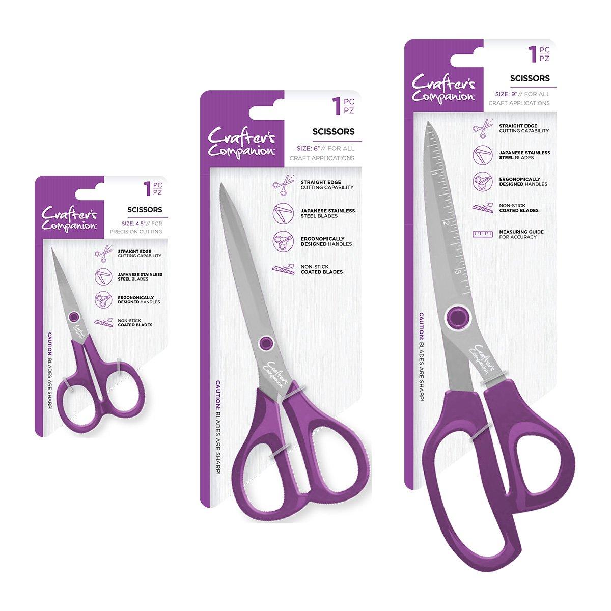 An Ultimate Collection of Crafters Companion Scissors: STAY SHARPER FOR LONGER - Made from Japanese stainless steel, the Crafters Companion straight edge scissors are made for durability and resilience. The perfect sharp scissors for home, school and the office EASY-GRIP HANDLES - Ergonomically designed with maximum comfort and cutting precision in mind NON-STICK SCISSORS - Adhesive resistant Teflon-coated blades specifically designed to cut through adhesive-backed paper, tape and fabric with ease IDEAL FOR FINE DETAIL WORK - Fine straight-edged blades make these small scissors perfect for high precision crafts like sewing and knitting ALL-PURPOSE CRAFT SCISSORS - The perfect stationery scissors for all crafting projects from needlework to scrapbooking and card making