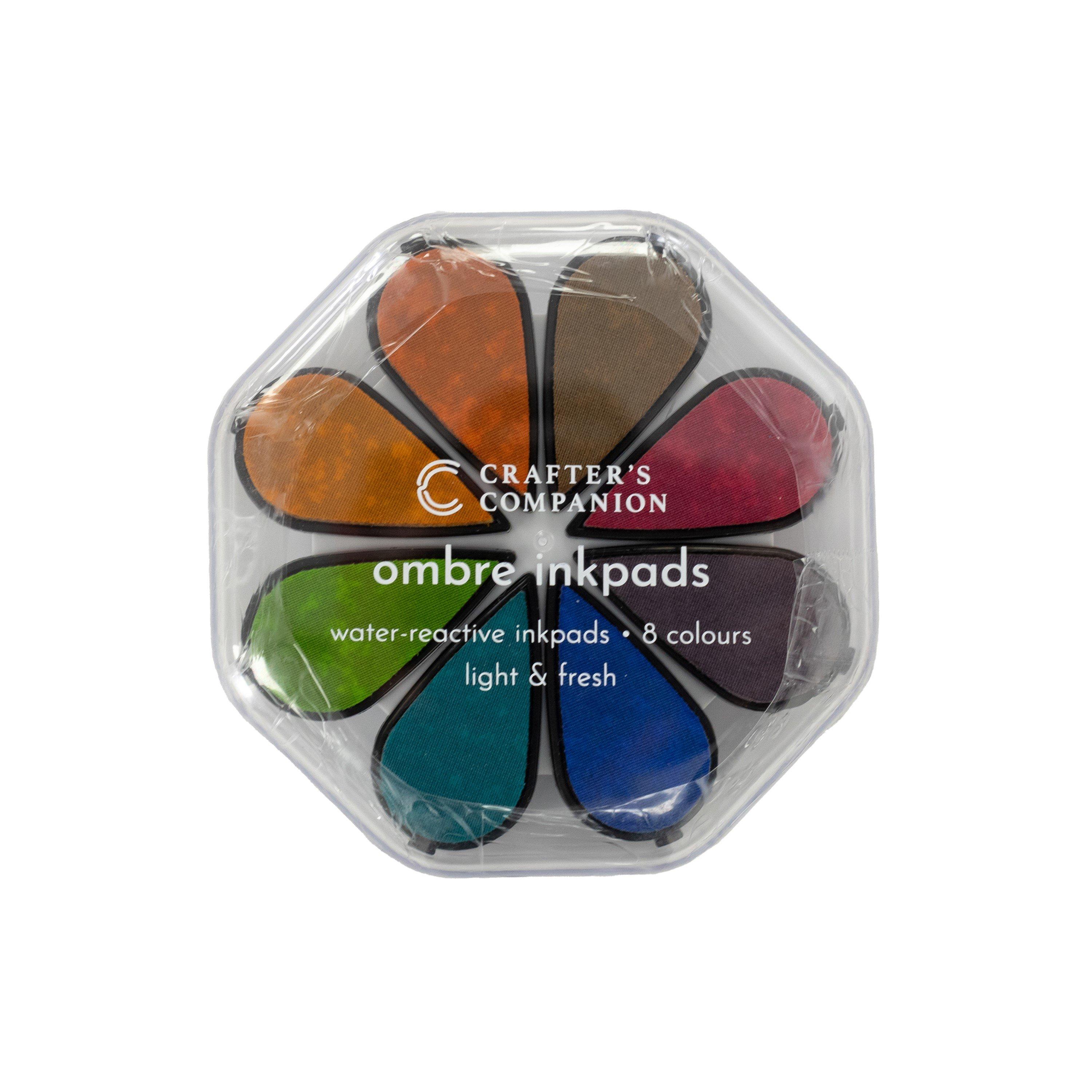 Includes eight colours of Water Reactive Ink: Honey Pot, Lemon Tonic, Spring Meadow, Oasis, Ocean Blue, Pale Fig, Pink Tulip, and Sandstone. Water-based ink. Part of the Water Reactive Ombre Inkpads by Crafter’s Companion
