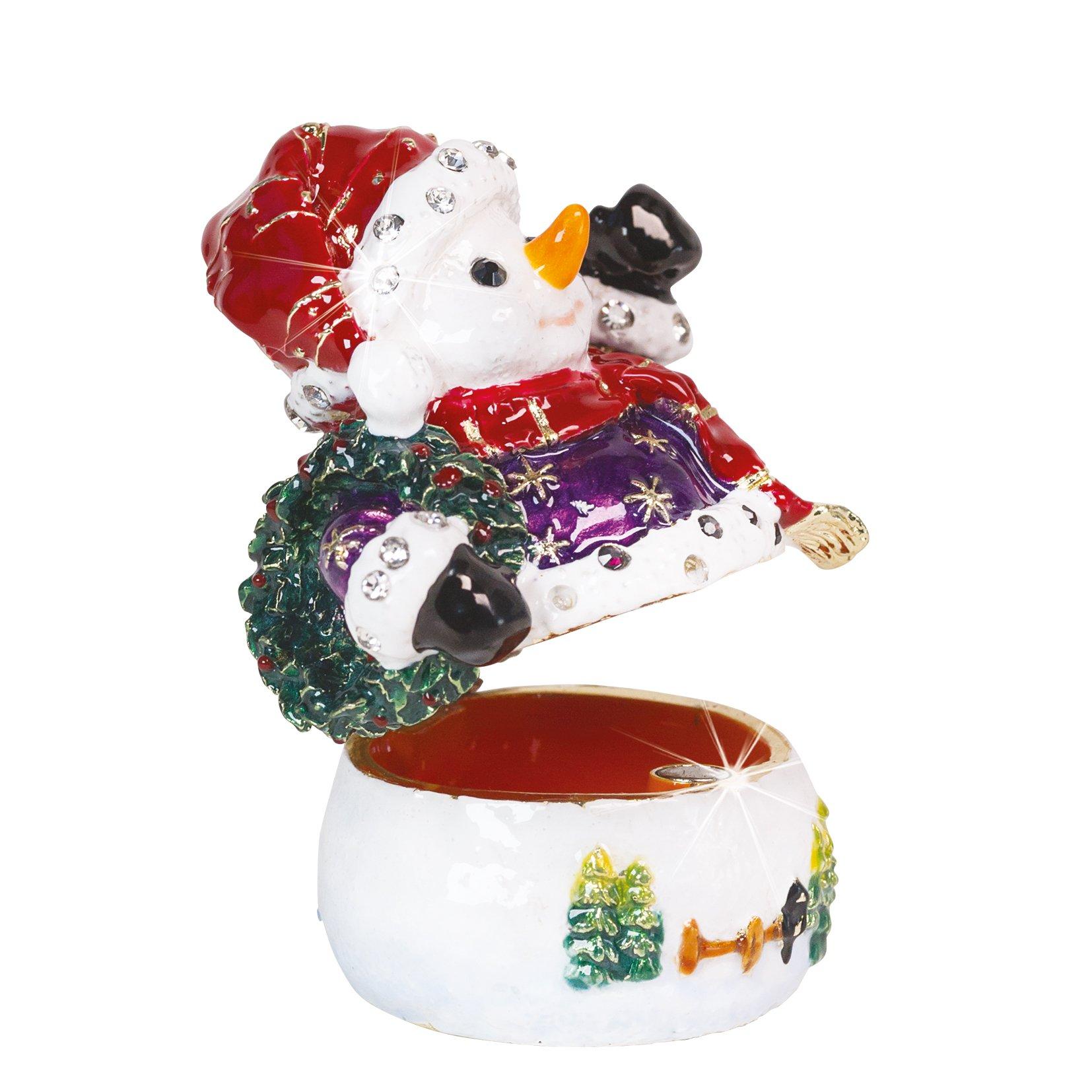 Craycombe Christmas - Snowman & Scarf A Beautiful seasonal trinket box, hand painted in vibrant enamels and embellished with crystals. Comes in a smart red gift box. 8cm H