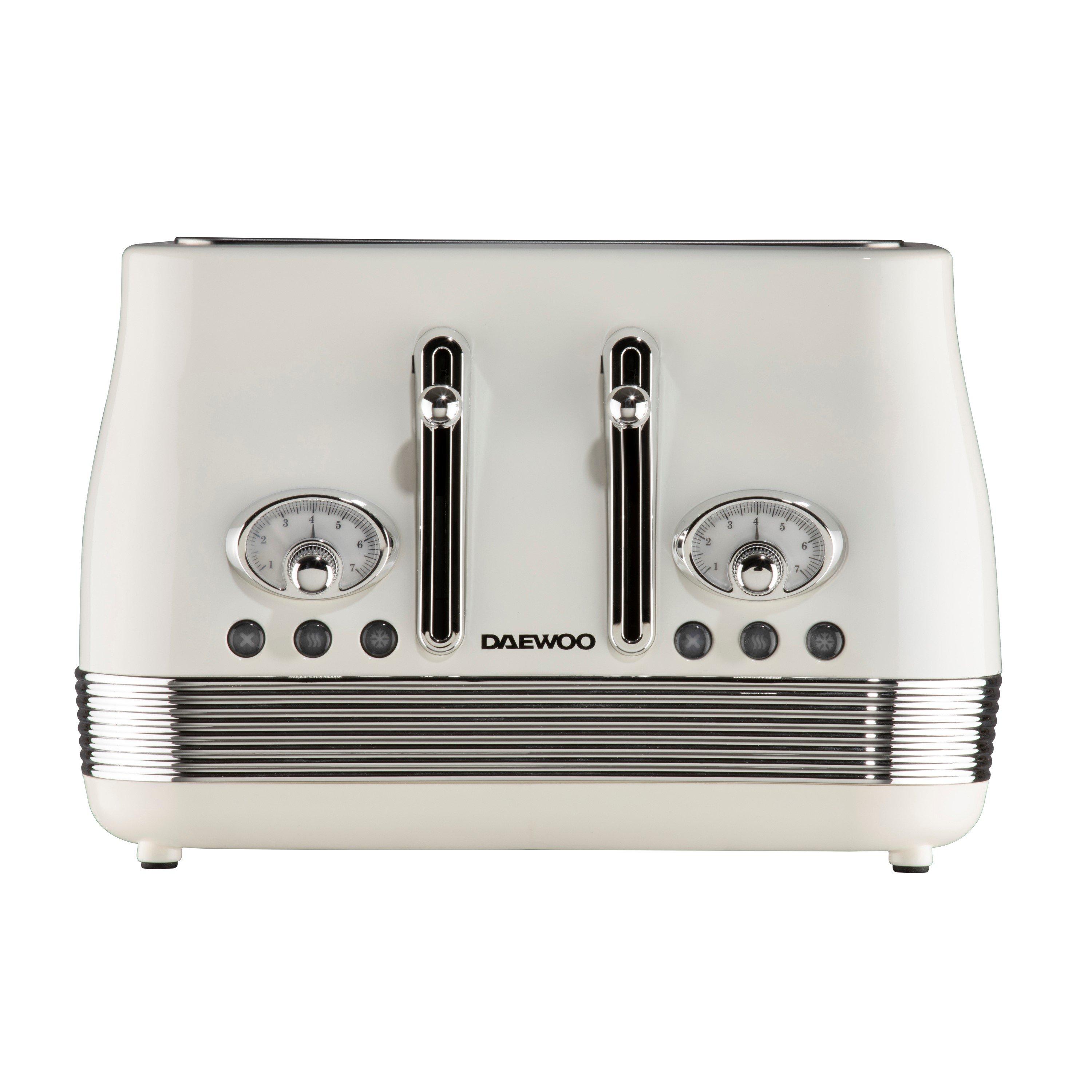 Enhance your breakfast routine and satisfy late-night snack cravings with the Daewoo Denver 4-Slice Toaster, the perfect addition to any kitchen that values style, versatility, and convenience. Designed for your comfort and safety, this toaster is packed with features to suit every preference. Achieve perfectly toasted bread and pastries with ease using its 7 adjustable browning levels, while the high-lift lever makes it simple to retrieve smaller items without hassle. Additional functions, including defrost, reheat, and cancel options, offer even greater flexibility. Keep your kitchen tidy and cleaning effortless with the removable crumb tray and built-in cord storage. Complete your kitchen look by pairing this toaster with the coordinating kettle from the Denver Collection, and enjoy peace of mind with a 3-year extended warranty when you register online.