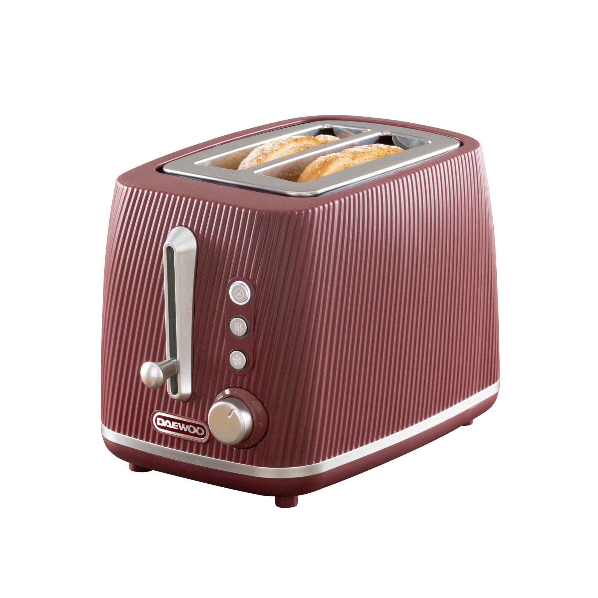 Bold Colour, Everyday Functionality The Daewoo Cascade 2 Slice Toaster in Ruby Red offers a bold update to your breakfast setup. Its deep red finish and textured casing add a rich pop of colour to your counter, while keeping the look clean and modern. Toast It How You Like It With variable browning control, it’s easy to get your toast just right - whether you’re warming up crumpets or crisping thick-cut slices. Extra Functions for Real Life Defrost frozen bread, reheat forgotten slices, or stop the toasting mid-cycle with dedicated buttons designed for everyday convenience. Neat, Simple and Practical The crumb tray slides out for easy cleaning, and the compact shape won’t take up much room - ideal for smaller kitchens or streamlined setups. Complete the Look Pair it with the matching Cascade kettle in ruby red for a kitchen that’s stylish, calm, and coordinated. 3-Year Extended Warranty Register online to activate your extended 3-year extended warranty - a mark of quality you can rely on, every day.