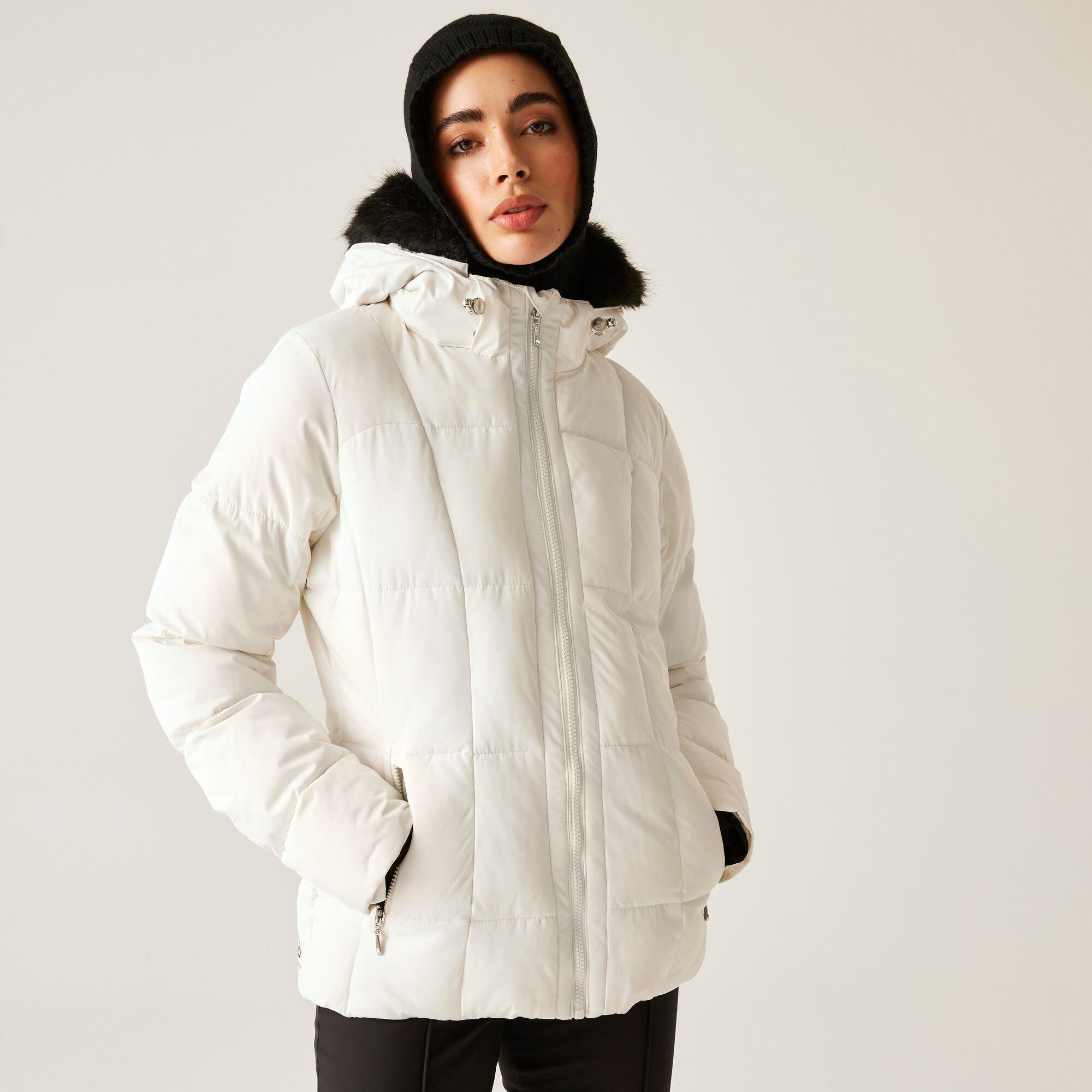 - Integrated ski features including fixed snowskirt with gel grip and pass pocketoice for style-conscious skiers. Recycled polyester waterproof & breathable fabric - Ared 10,000 Badge & zip pullers embellished with Swarovski crystals Complete ski features (incl hidden ski pass pocket in inner lining and fixed snowskirt with gel grip) Detachable hood with adjuster and removable faux fur trim (makes for easy washing) Recycled polyester high warmth padding PFC, PFOA, PFOS compliant Water repellent finish Warm inner sleeve cuffs 2 lower zipped pockets 1 x zip inner pocket & mesh stow pocket with goggle lens wipe cloth Adjustable shockcord hem
