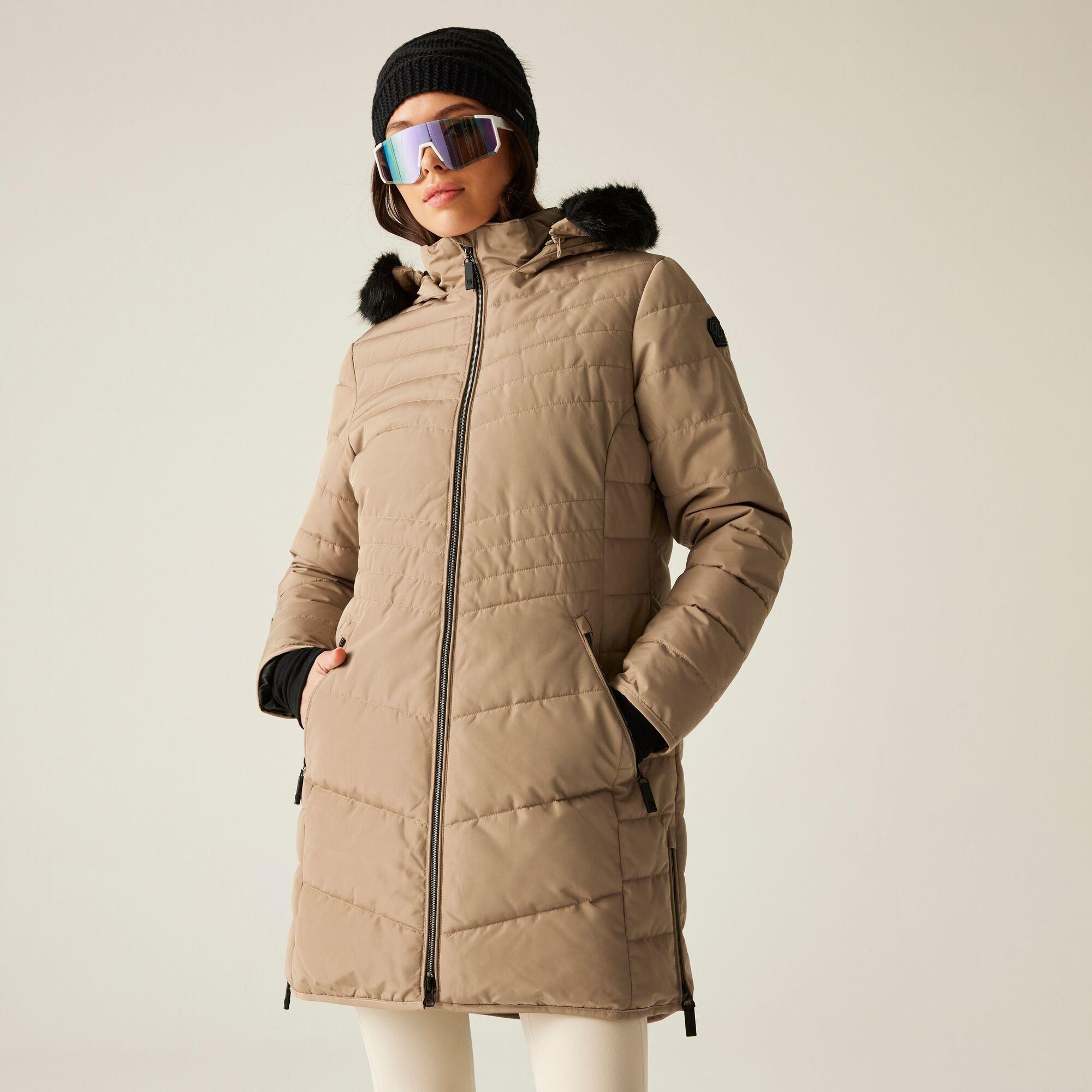 The Dare 2b Striking IIII Jacket, crafted from advanced waterproof and breathable fabric, keeps you comfy in all weather conditions. The water-repellent finish adds an extra layer of protection. You'll stay on-trend and warm with the padded silhouette design that's filled with recycled high warmth insulation. The quilted recycled inner lining offers additional warmth and comfort. For convenience and style, the adjustable hood comes with a removable faux fur trim. This ladies winter jacket is perfect for the everyday, and is finished with a two-way centre front zip for ease.