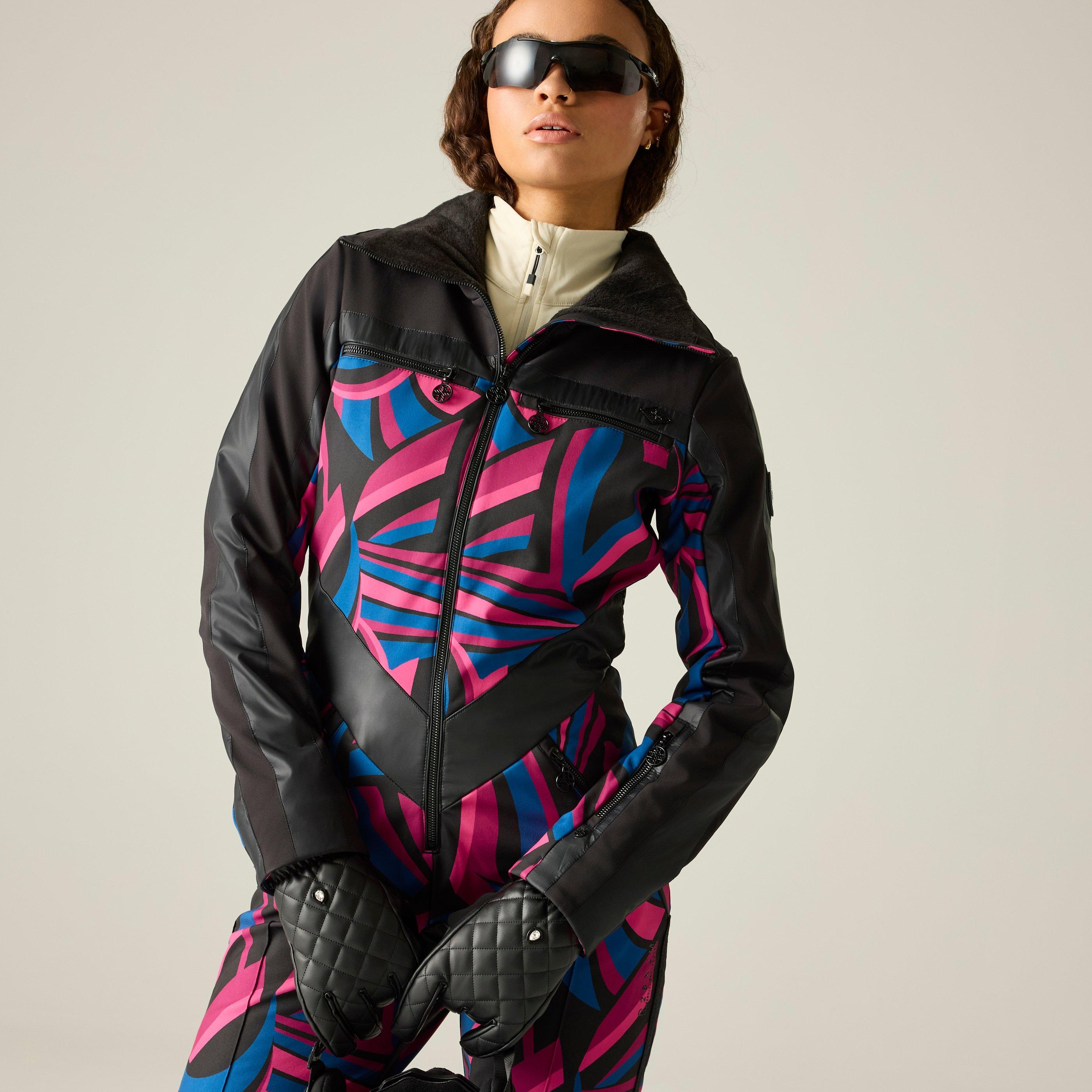 The Dare 2b x Julien McDonald Supremacy II Snowsuit is made from lightweight, waterproof and breathable softshell fabric to keep you warm and dry on the slopes. Complete with full ski features, including a ski pass pocket to keep your hands free and built-in gaiters to stop any snow getting in. Finished with premium hardware and a bootcut design to keep you looking effortlessly stylish on the slopes. Recycled polyester waterproof softshell fabric - Ilus D-Lab Softshell Waterproof and breathable fabric - Ared 15/15 Water repellent finish PFC, PFOA, PFOS free Contrast panel detail Complete ski features (incl ski pass pocket, snow gaitors and a zip gusset at hem) Premium metal hardware throughout for complete luxe finish Metal effect centre front zip with inner zip and chin guard Recycled polyester lining 2 x chest pockets and 2 x lower pockets with metal effect zips Slim leg with bootcut hem & metal effect zips, perfect for going over ski boots Abrasion resistant fabric binding to hem for extra durability
