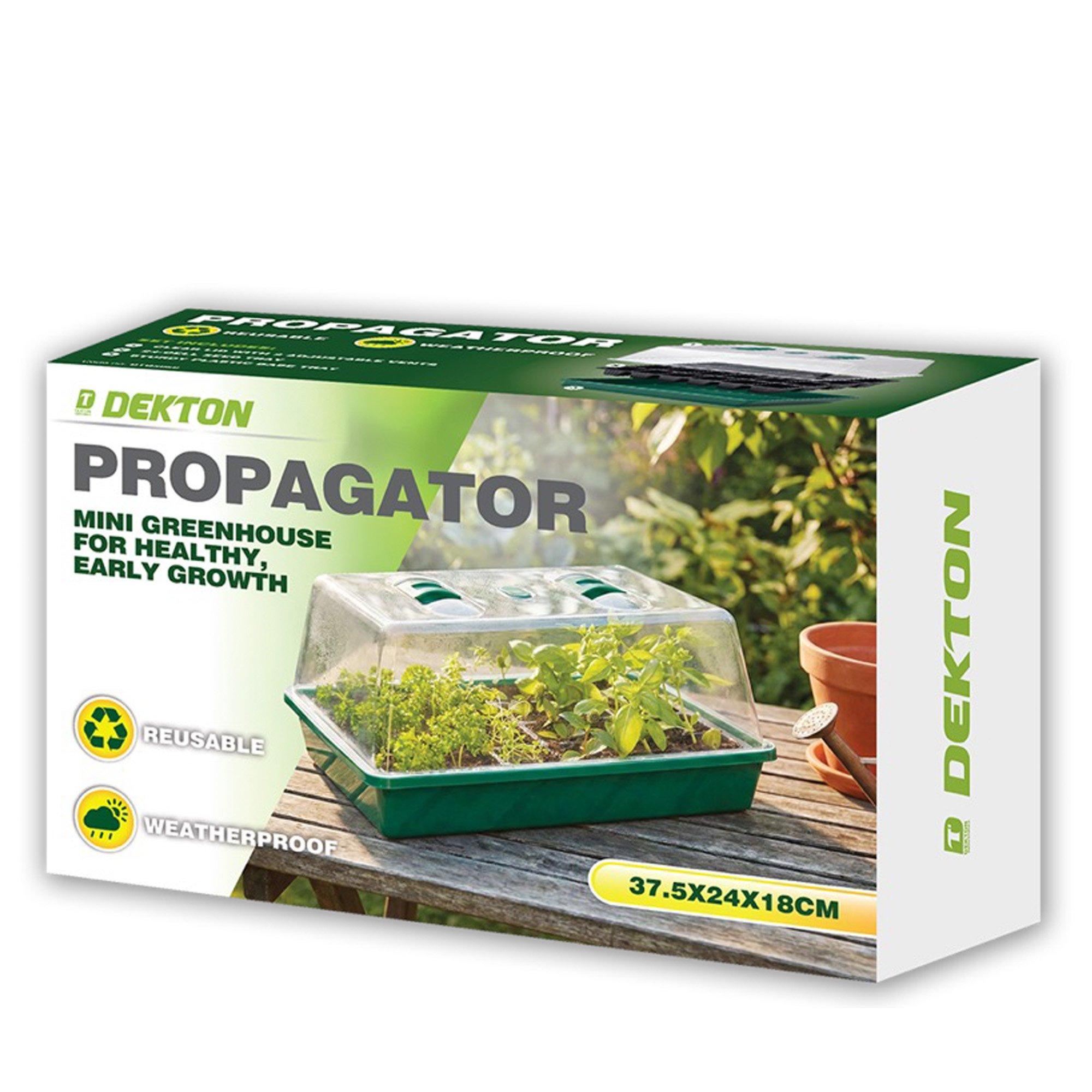 The Dekton propagator is constructed from durable, thick plastic that is both reusable and able to withstand pressure without losing soil or absorbing too much moisture. The seedling tray features a control humidity dome that can be opened or closed at any time. Adjustable vents on the dome allow you to regulate temperature and humidity, making it easy to observe seedlings without disrupting growth. The dome also helps to maintain moisture and a constant soil temperature. Dimensions 37.5cm x 24cm x 18cm.