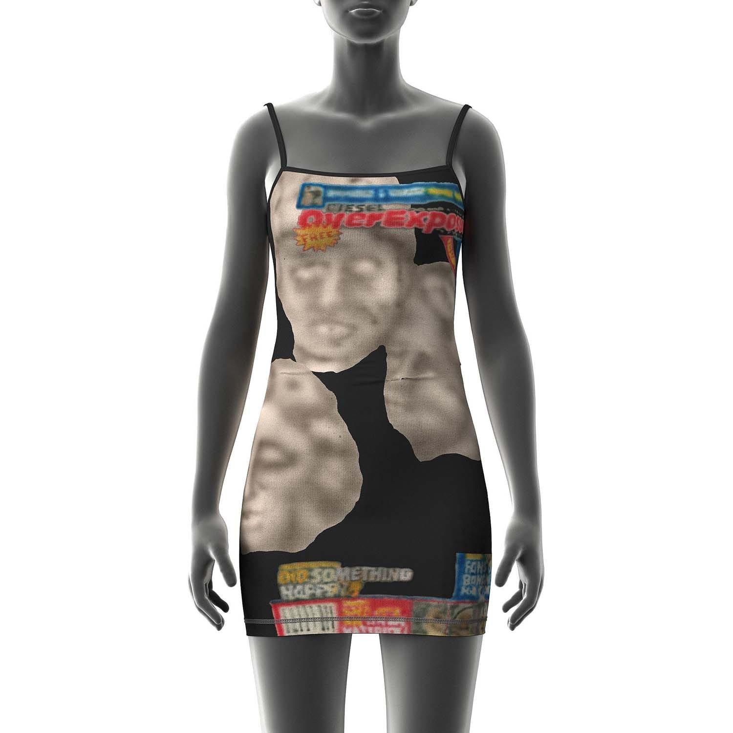 This women's short dress is cut from ribbed stretch fabric containing TENCEL fibres it's printed with a contemporary airbrush artwork and Diesel logo motifs against a white backdrop. Slender spaghetti straps frame the bodycon silhouette.