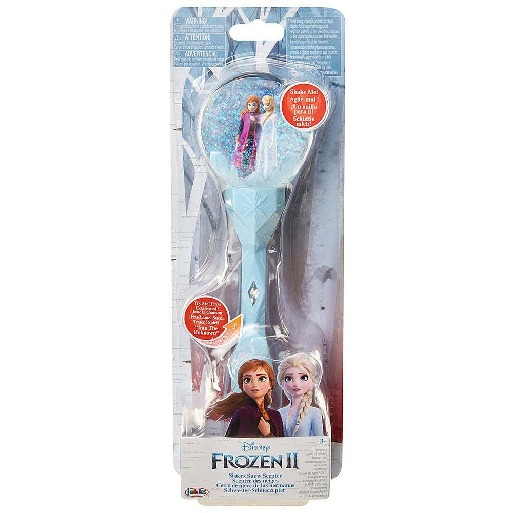 Celebrate the unbreakable bond of family with Disney Frozen 2 Sisters Snow Scepter. Anna and Elsa are dressed in their adventure outfits, ready to face the outside world together. Wave the scepter and watch as a flurry of glittering snow swirls around the sisters! Scepter features elements inspired by the film and the instrumental version of Into the Unknown from the film.