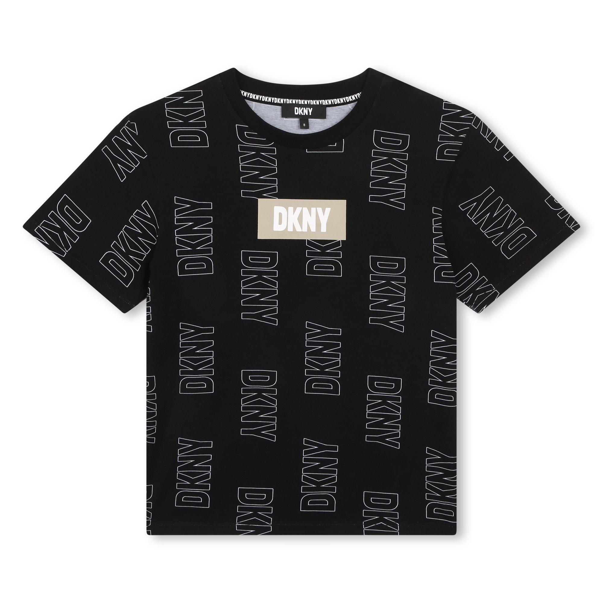 DKNY's Kids' All Over Print Regular Fit T-Shirt delivers urban-inspired style with a comfortable fit, featuring the brand's graphic pattern across the fabric.