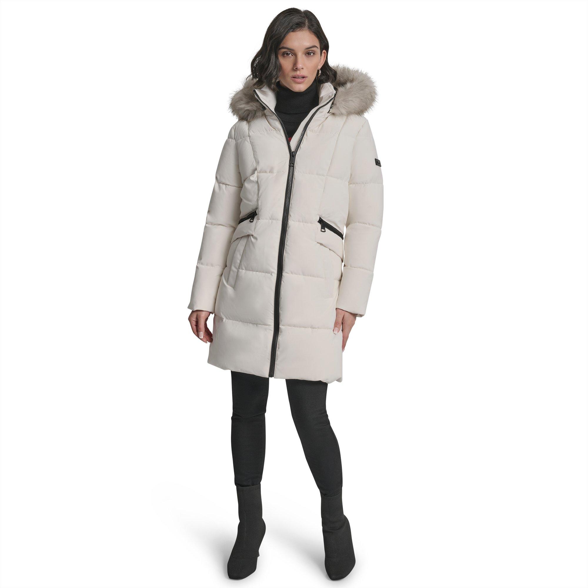 DKNY Women's Quilted Fur Hood Tailored Fit Medium Puffer Jacket