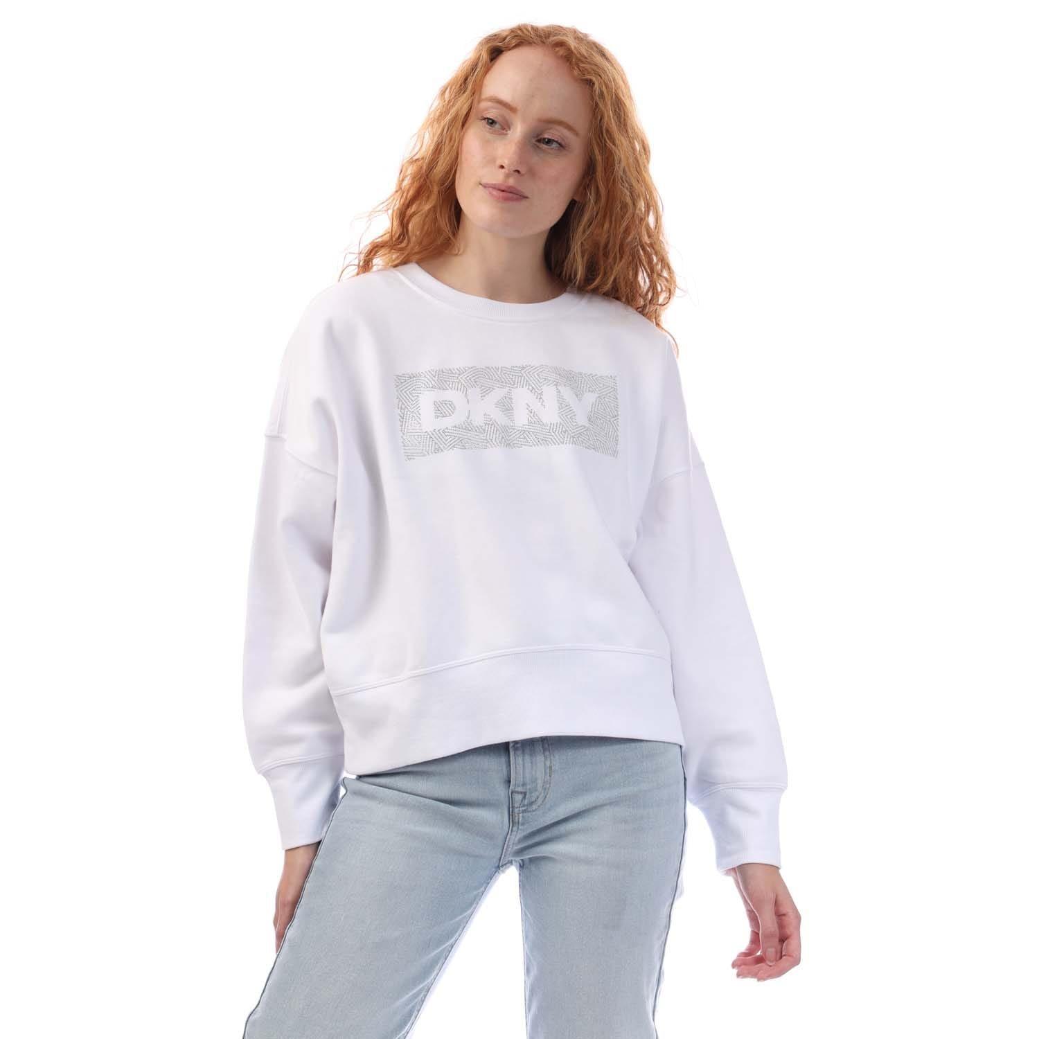 Womens DKNY Rhinestone Crosswalk Crew Sweatshirt in white.