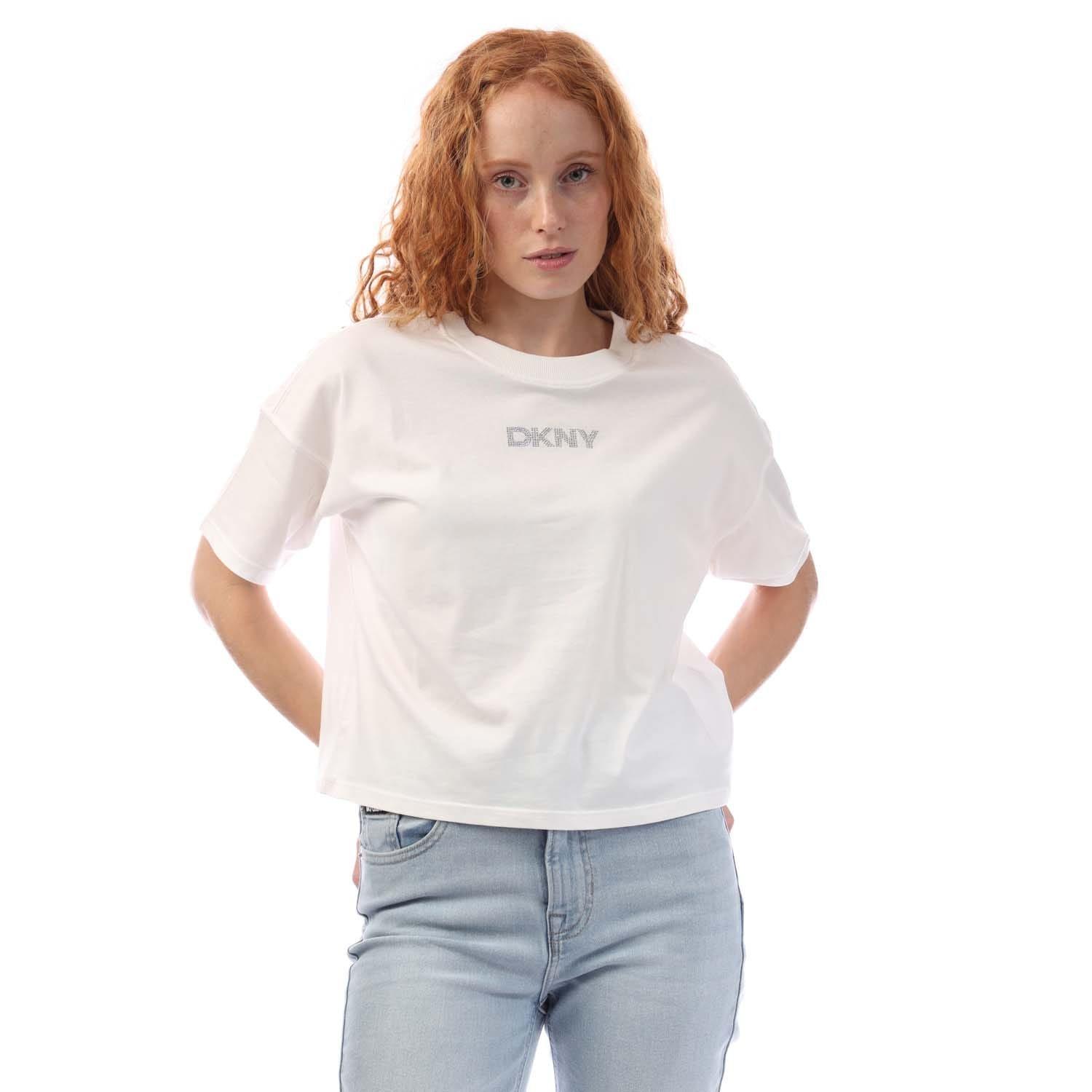 Womens DKNY Rhinestone Logo Crop Ss T- Shirt in white.
