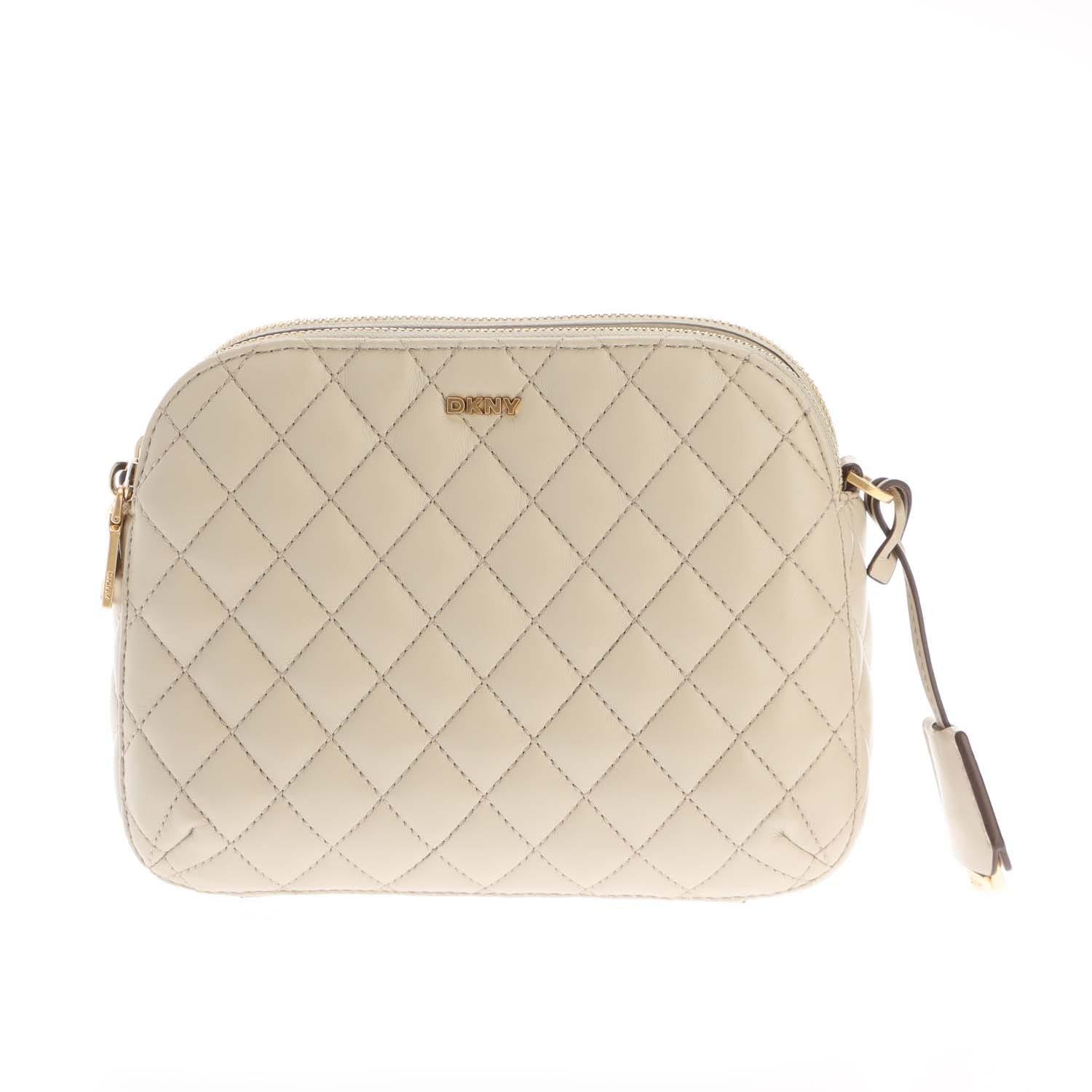 Quilted crossbody bag with a double zip closure and gold-tone hardware.